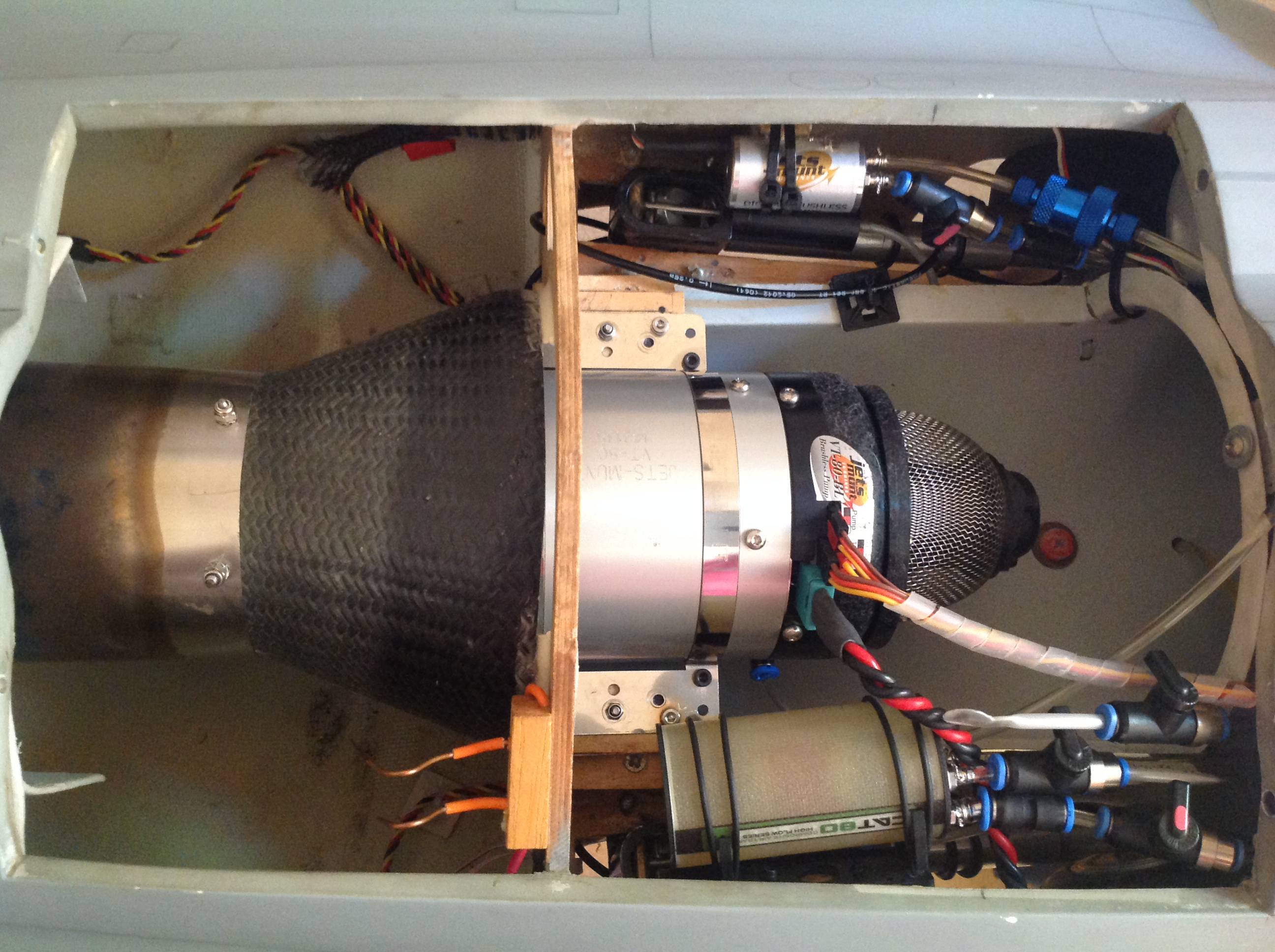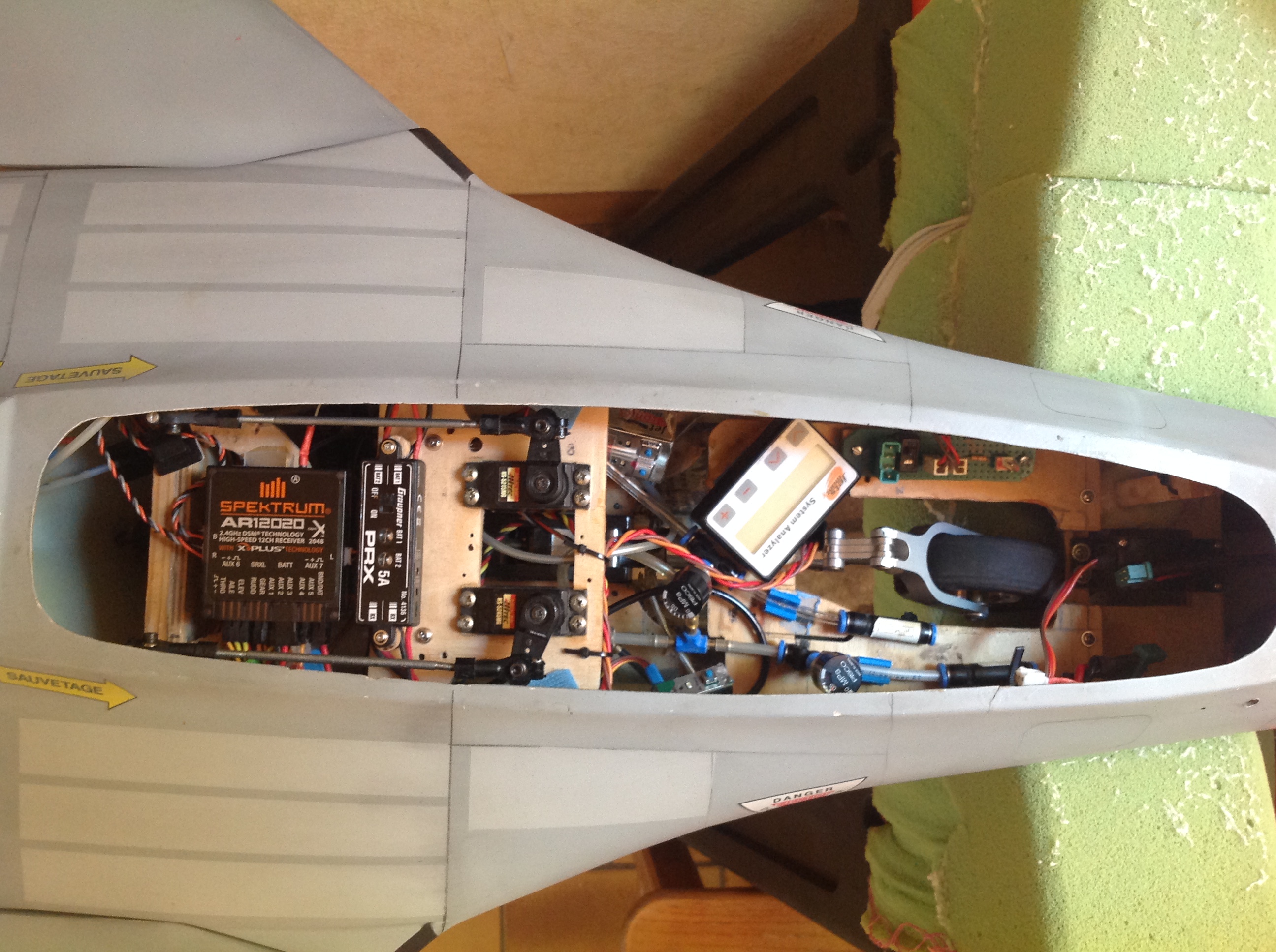 je mets une photos de l'installation moteur auquel j'ai ajouté un antibulle.j'ai également fait en sorte d'ouvrir et fermer rapidement le réservoir sous l'avion afin de controler visuellement et au toucher le remplissage de la poche .nous avons aussi rendu fonctionnelle la dérive.