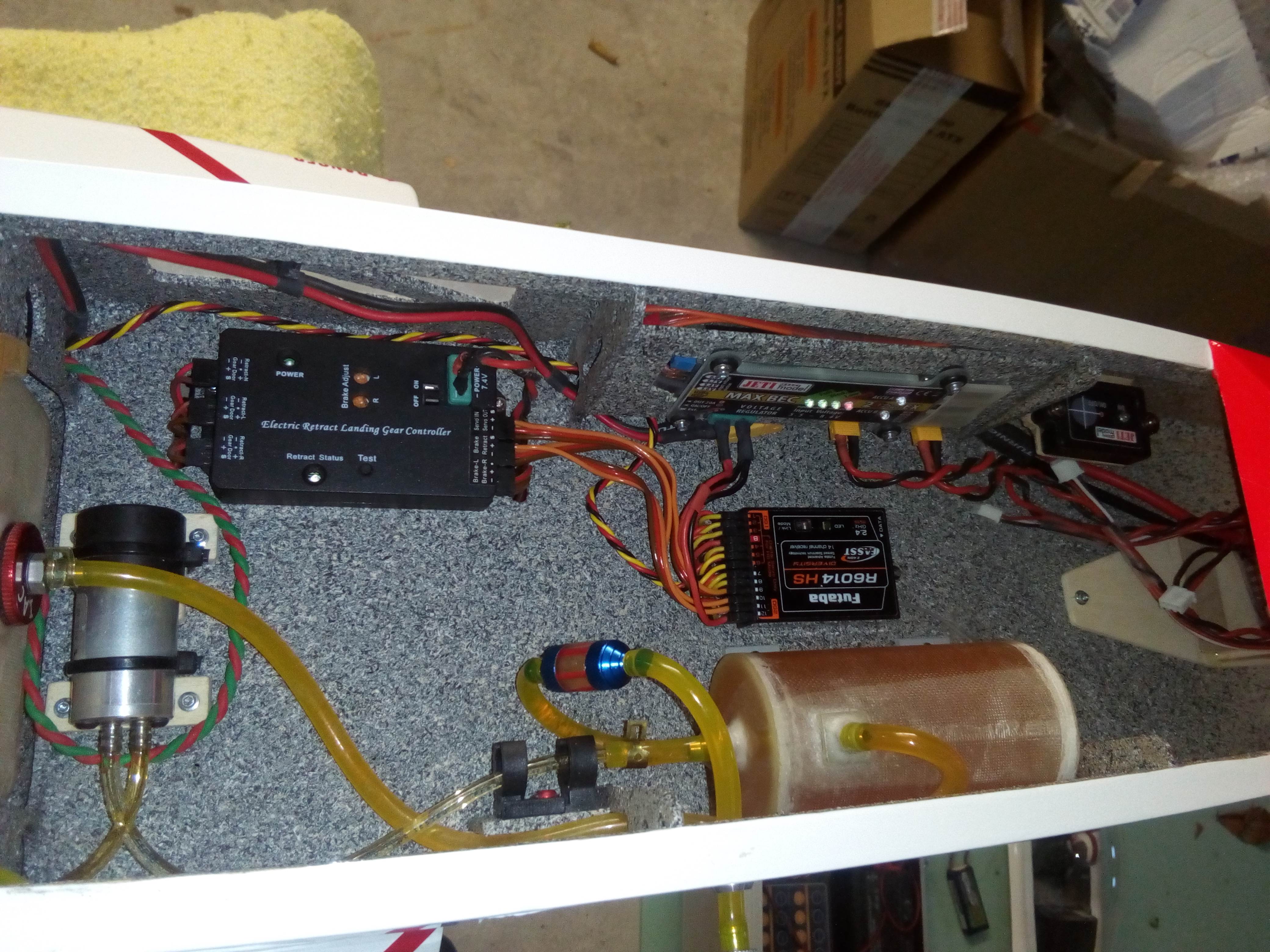 Le TURBI pèse 8kg125 à vide. Equipé d'une WREN 100 d'occas presque neuve, 3 TRAINS RENTRANTS SLR de chez Lindinger, un réservoir et un UAT stratifiés maison, servos SAVOX et GRAUPNER numériques, interrupteur et régulateur JETI... et quelques modifs à ma façon...