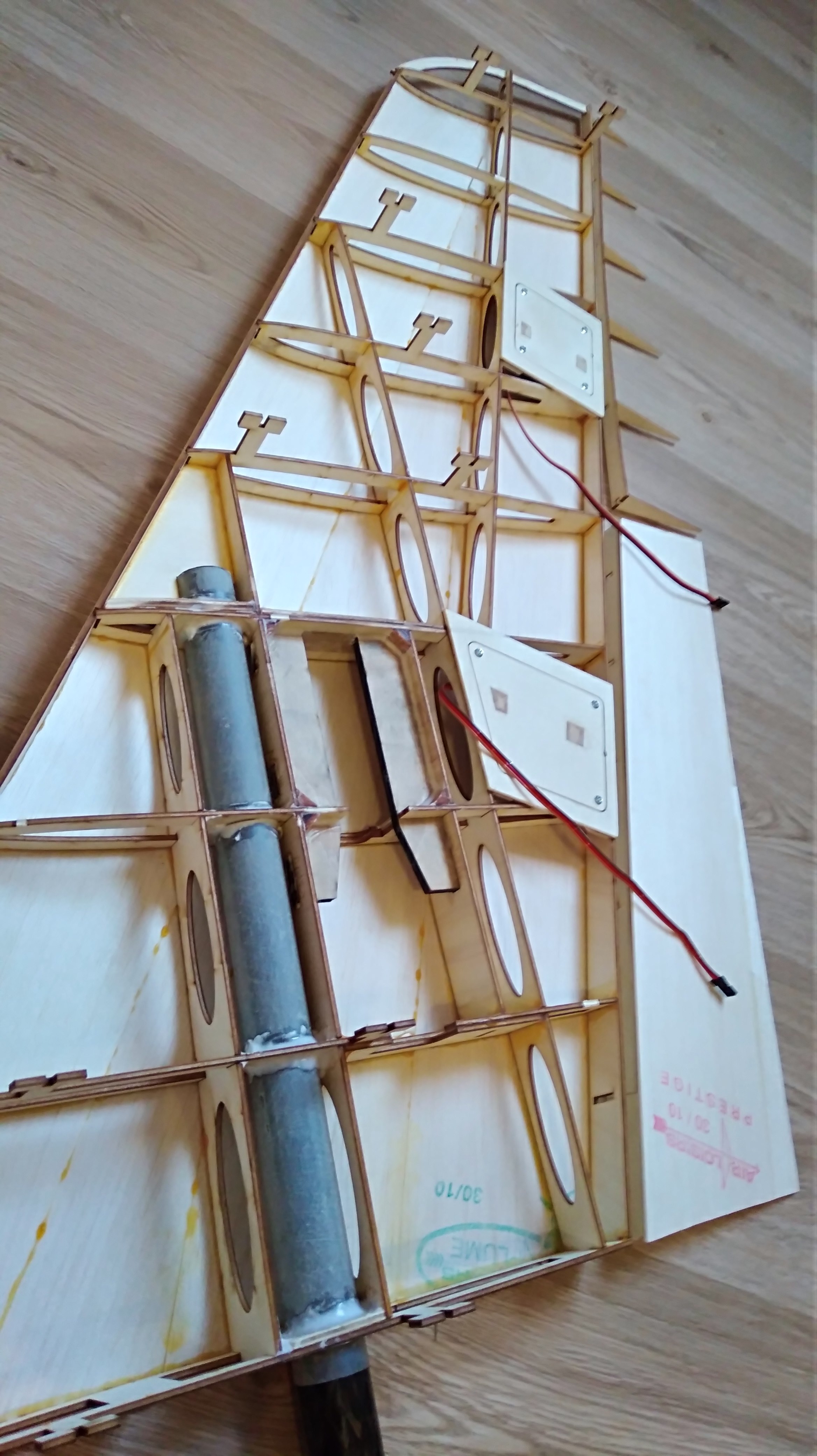 Et boitiers de servos en place ; je pense fixer à demeure dans les ailes toutes les rallonges, avec prises débouchant dans les boitiers. C'est plus simple que des tunnels avec des rallonges à tirer en cas de démontage..