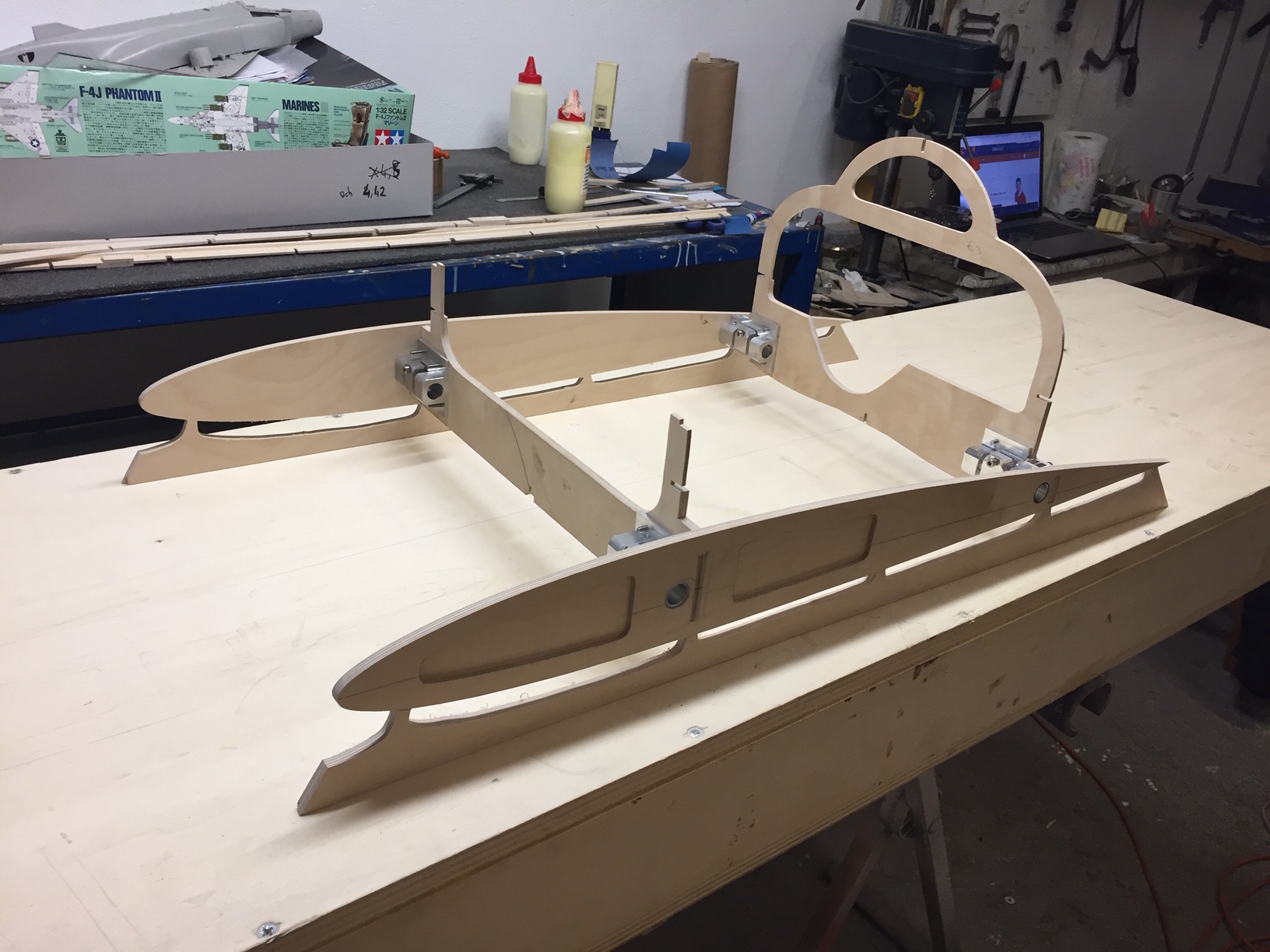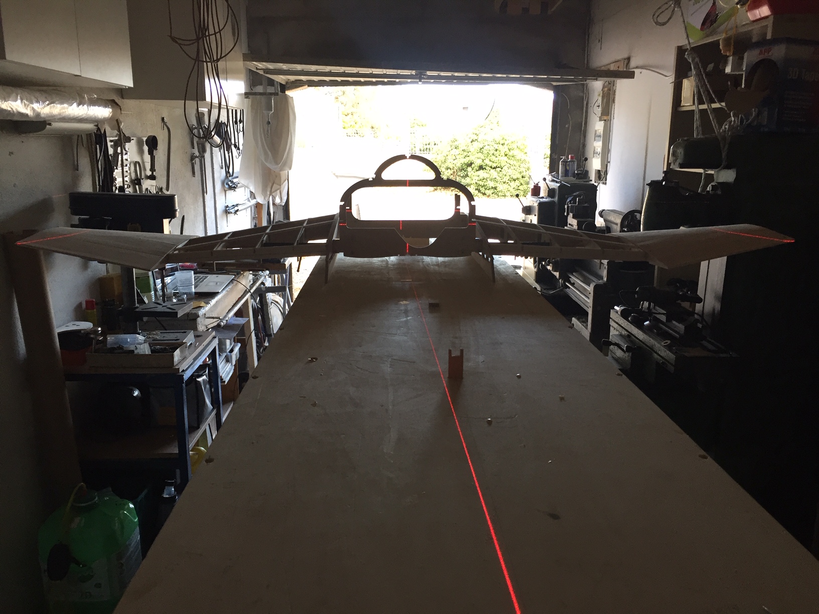 Bonsoir à tous, donc aujourd hui premier montage à blanc du fuselage dans son integralité. J ai collé 6 supports sur le chantier pour garder le fuselage bien droit. Les nervures d emplantures ont un talon qui positionne la corde à 1.5° (comme sur le plan), la hauteur du talon est determinée avec la hauteur des supports (il vaut mieux etre precis dans son dessin). Comme vous pouvez le voir sur les photos j ai choisi de ne mettre qu une seule tuyere, qui sera incliné de 4.5° vers le bas et 6.5° sur le coté droit. Prochaine étape realisation des supports d ailes (fourreaux en alu, qui assurent guidage et serrage des clés d aile) sur le même principe que ceux prévus par l'auteur. Photos