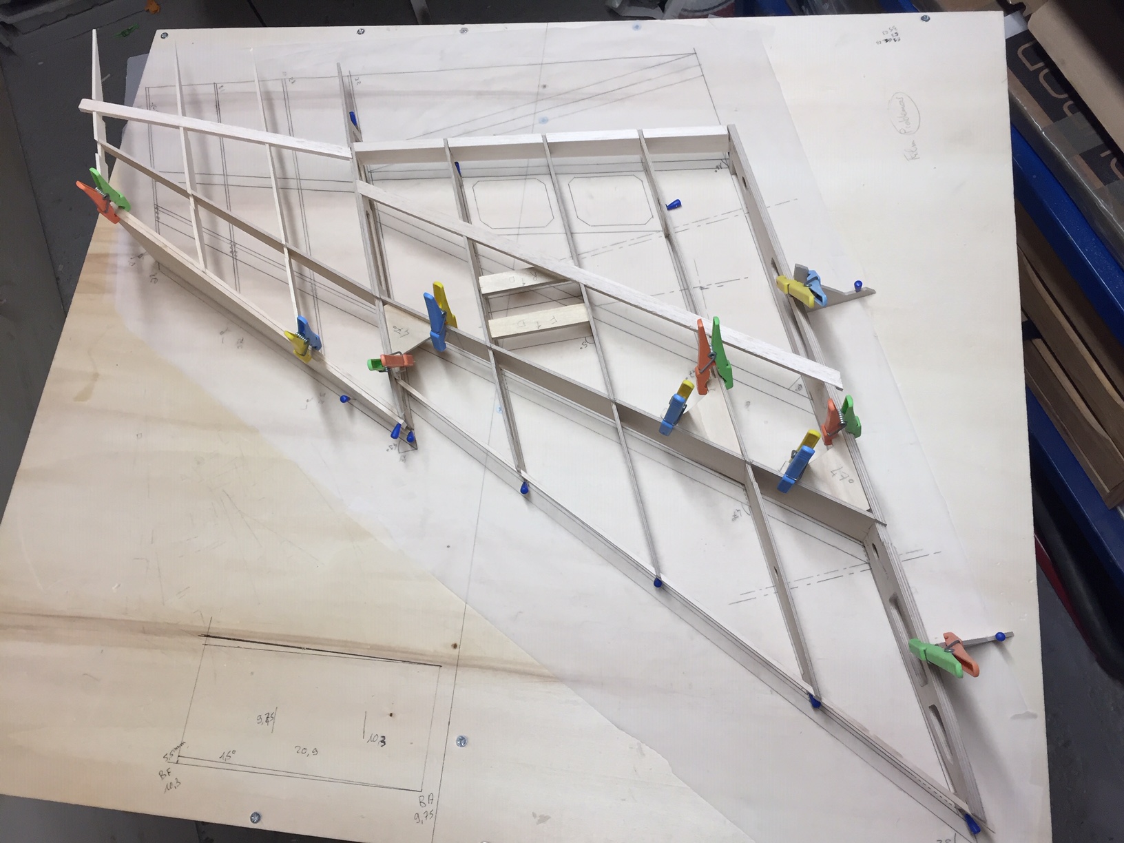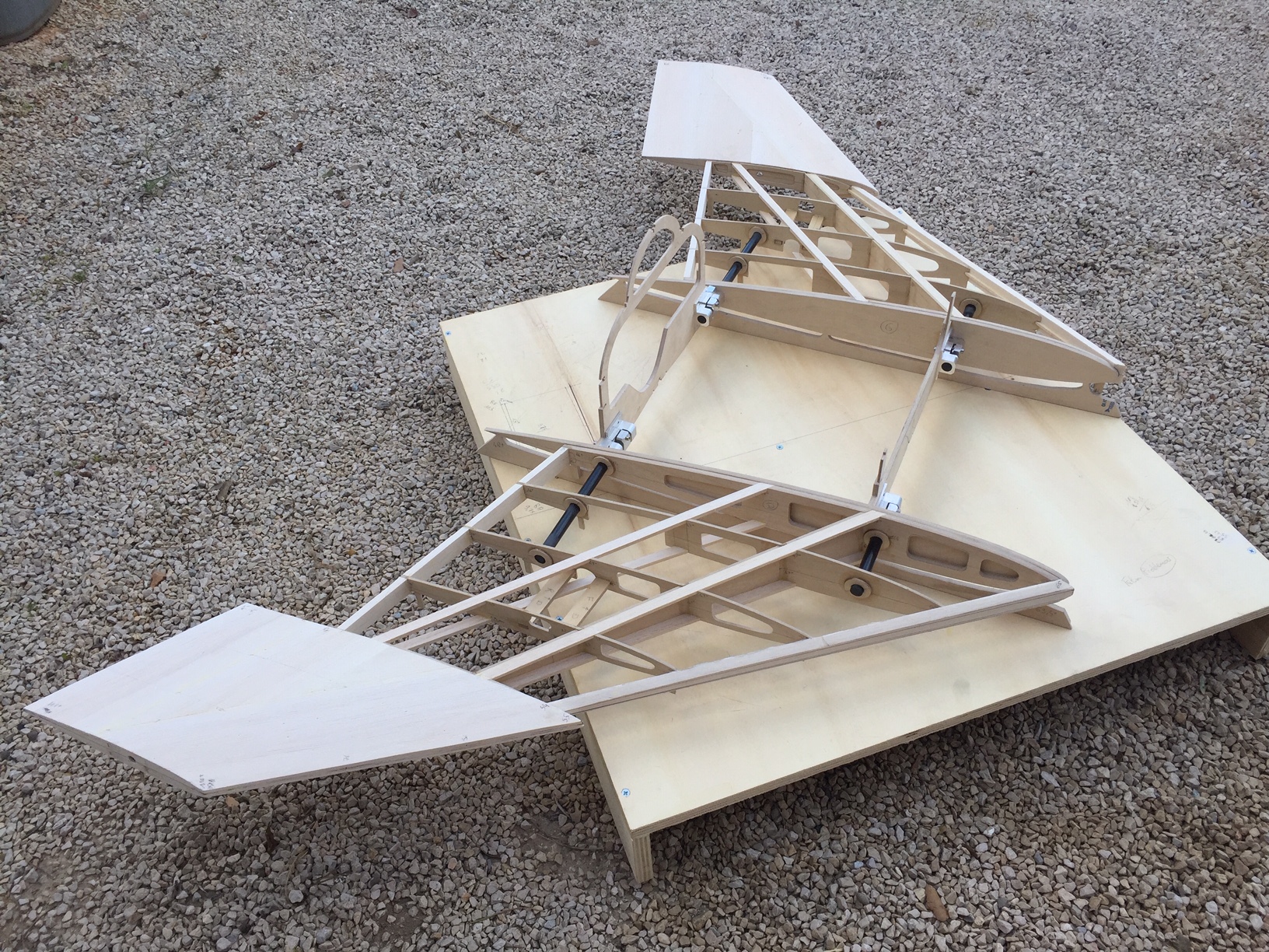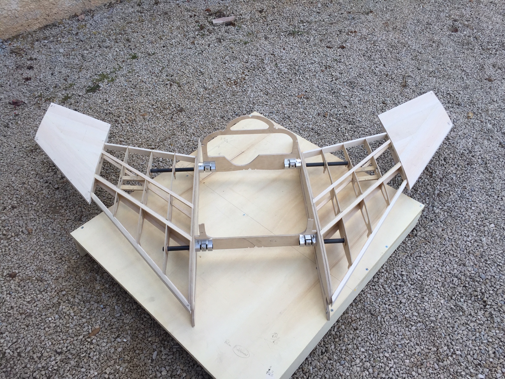 le plan de l aile est terminé, les pieces sont decoupées et j ai fait comme à mon habitude un montage à blanc. La seule modification a été de reduire le diedre à 12° au lieu des 15° prévus. J ai mis aussi 1.5° de vrillage négatif a partir de la deuxieme partie de l aile. Demain debut de la construction par l aile droite et donc premier collage je vais enfin voir ce "tas de bois"prendre forme...Photos