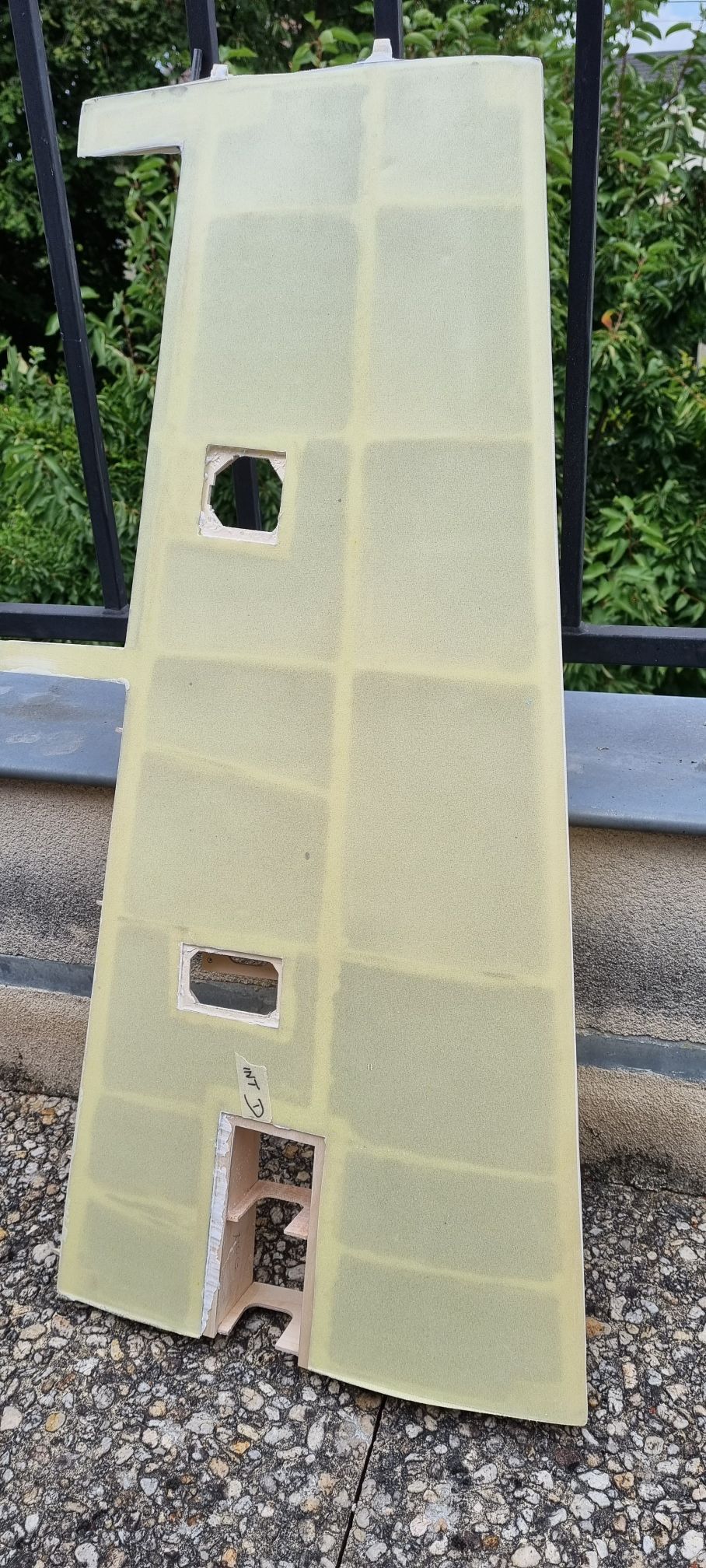 Les premiers essais ont été très prometteurs, même si l optimisation du process a demandé plusieurs semaines. La première peau fabriquée concerne l intrados, l aspect est glacé avec une dureté en surface surprenante pour un poids affiché sur la balance de 274 gr. Cette rigidité permet de réduire le nombre de nervures, l ossature est malgré tout constituée d un longeron en ctp bouleau multiplis de 30/10, comme les deux nervures qui supportent le bâti du train, les autres nervures sont en peuplier de 30/10.