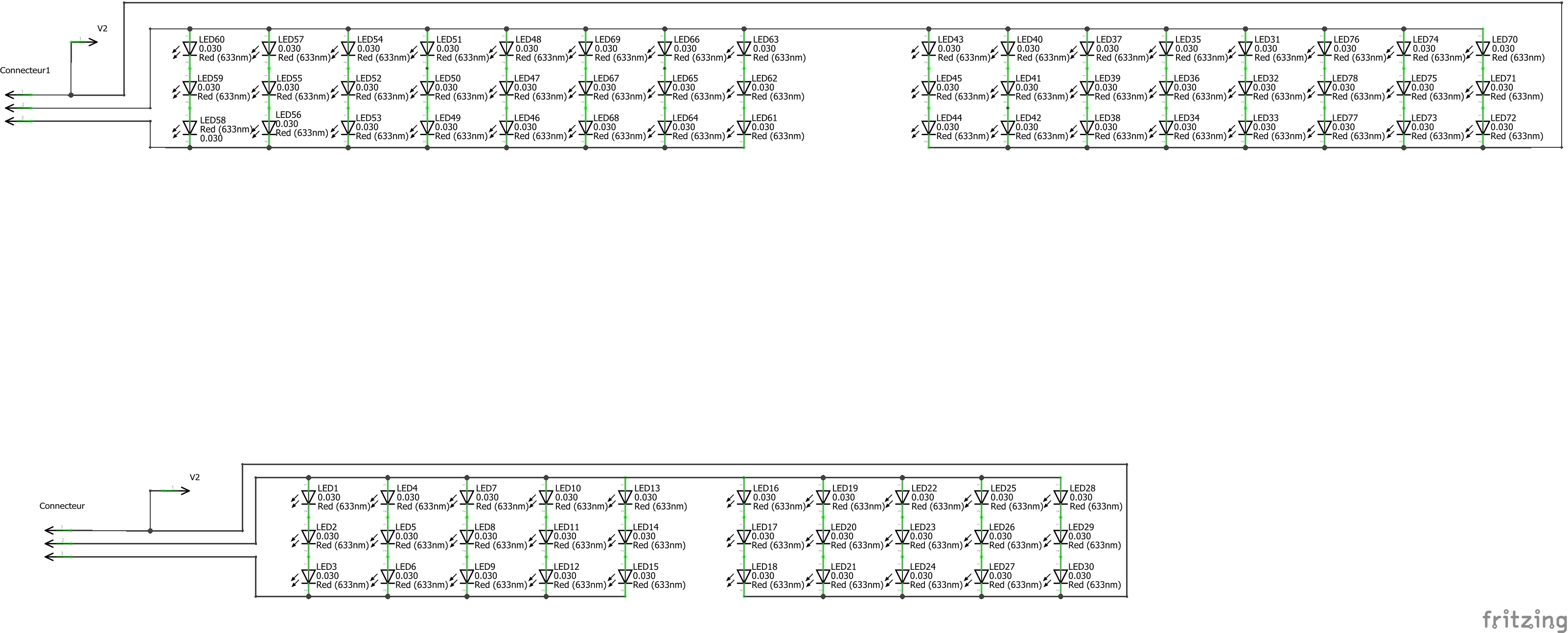 Les anneaux de Led sont construits à base de regroupements de 3 Led en série pour alimenter en 6.7V. Ces groupes de 3Led sont montés en parallèles selon le schéma suivant :