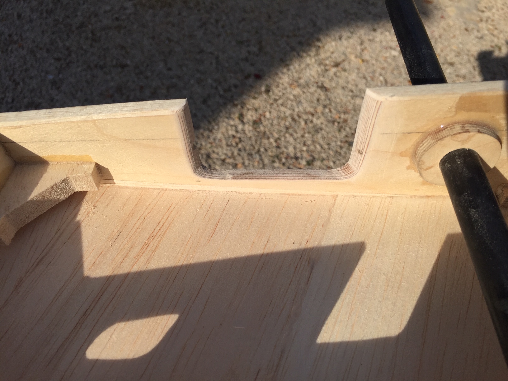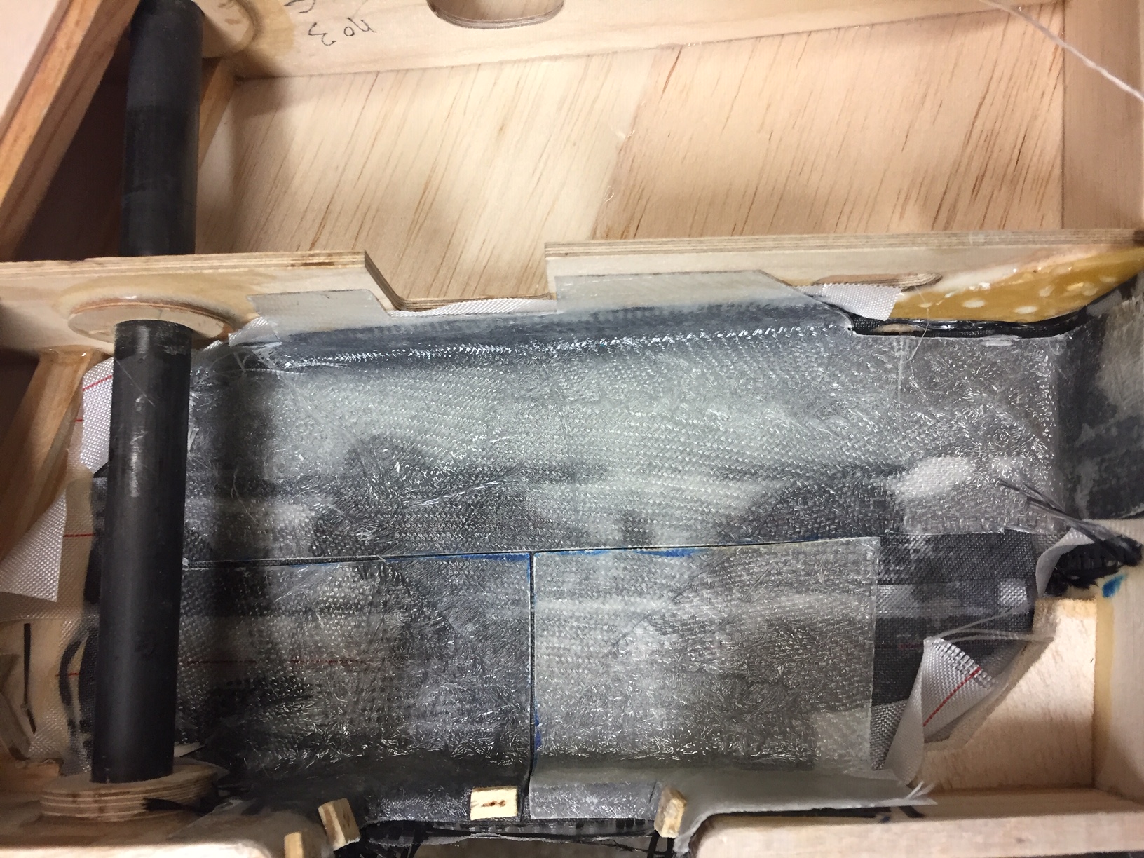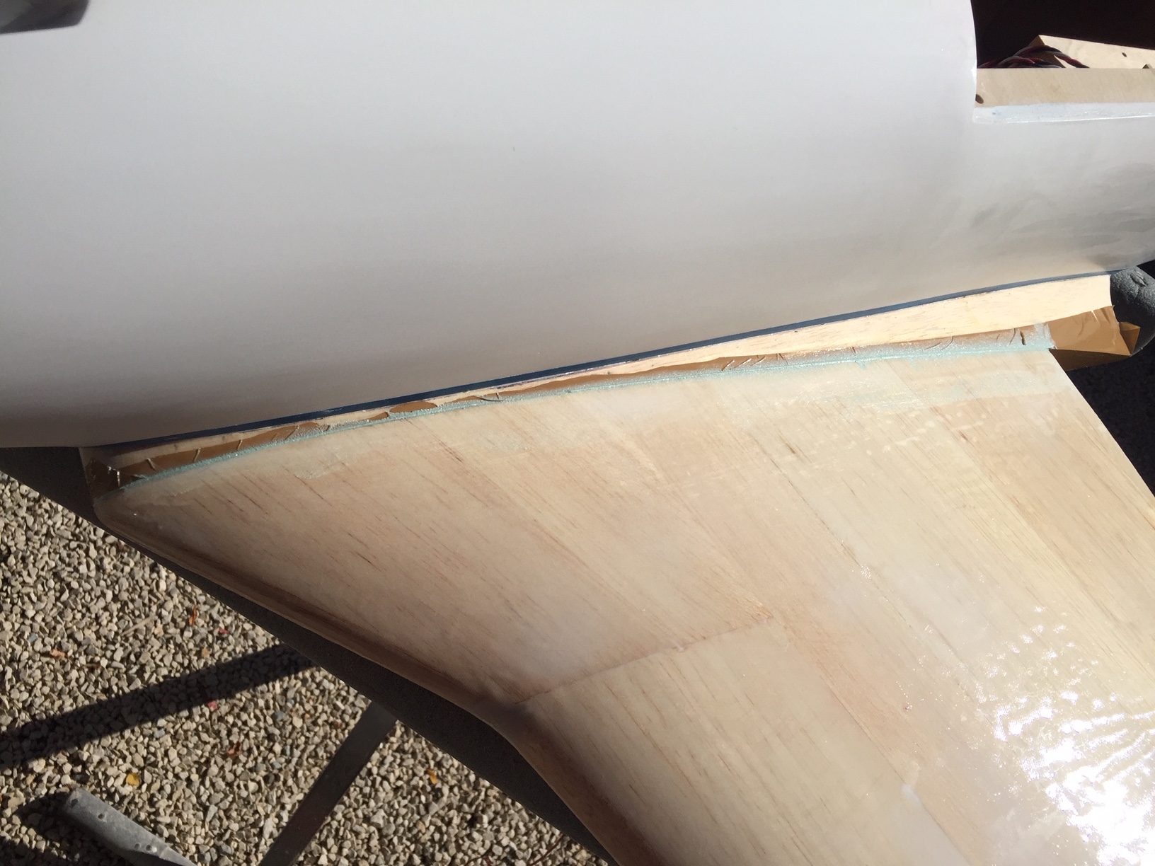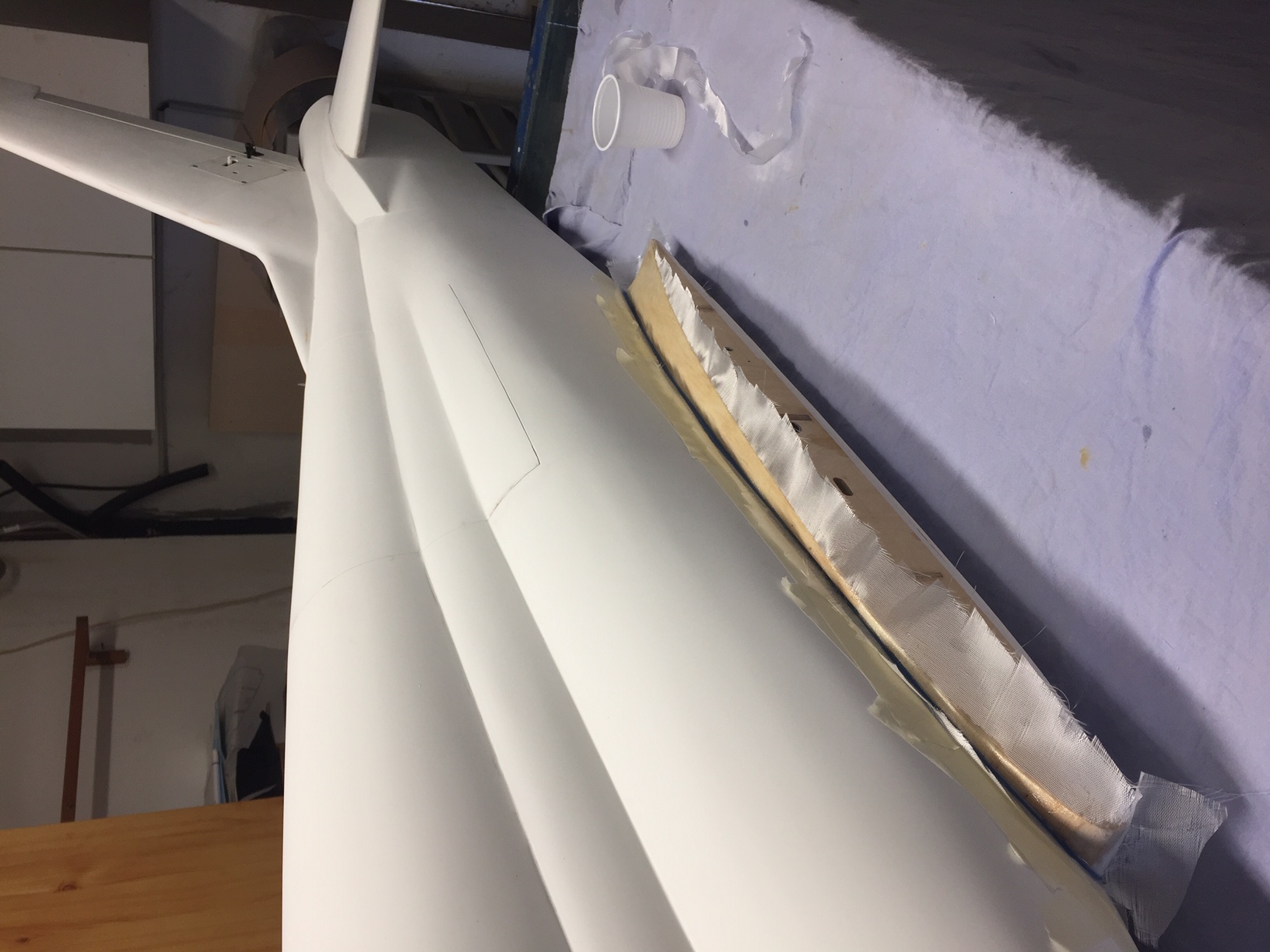 Bonjour à tous, donc aujourd hui finition du renfort en carbone j ai été un peu juste avec la resine, la fibre a bien été impregnée mais pas sufisament pour mouiller le tissu d arachage ce qui donne un etat de surface pas super regulier :( . Fixation de l aile, 2 vis M5 avec ecrou a griffe un dans le fuselage (vis arriere) et un dans la nervure (vis avant) decoupe dans le fuselage pour le passage de la roue (je ne sais pas encore si je vais boucher ce trou), et comme j y suis, pose d un joint (mastic) pour la finition entre le fuselage et l aile. Photos
