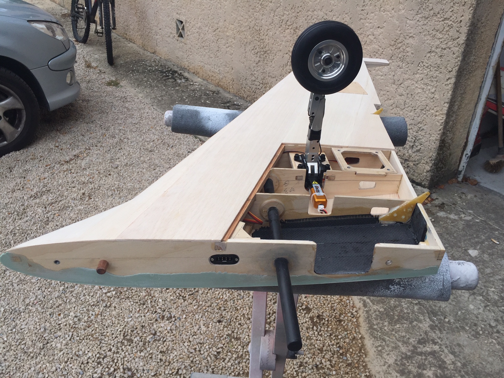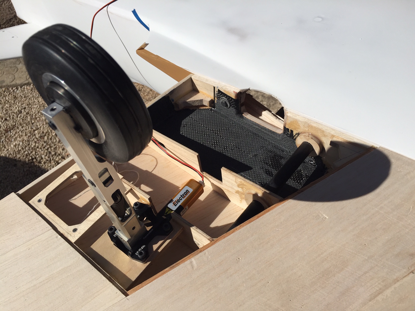 Bonsoir à tous, reception des jambes de train aujourd hui et decoupe de la nervure comme prevu. Vu le morceau enlevé je vais renforcer avec de la fibre de carbone.