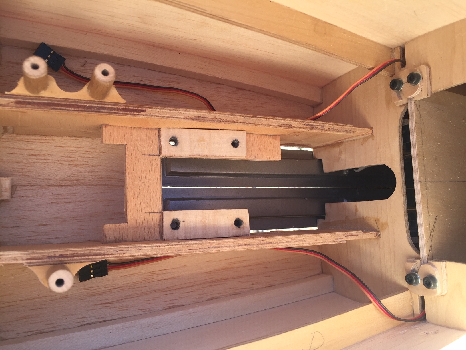 . Le "tiroir" avec les 4 accus se deverouille en devissant d un quart de tour les vis des arretoirs, ensuite ont tourne d un 1/2 tour ces arretoirs et on peut tirer le tiroir complet, le systeme de roulette peut aussi etre demonté avec tout le reste en place. Restera à placer l inter, fixation de l ecu (boitier reacteur), je vais aussi realiser des platines, que j inserrerai entre l aile et le fuselage pour controler le centrage plus precisement, maintenant que les elements sont fixés. Photos