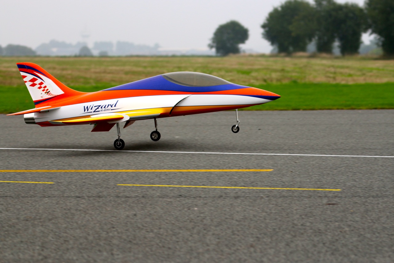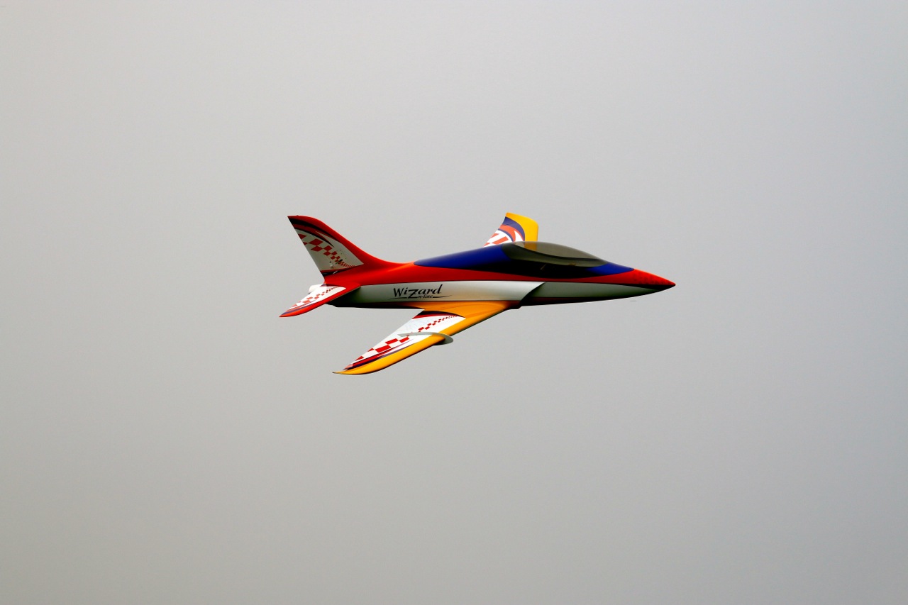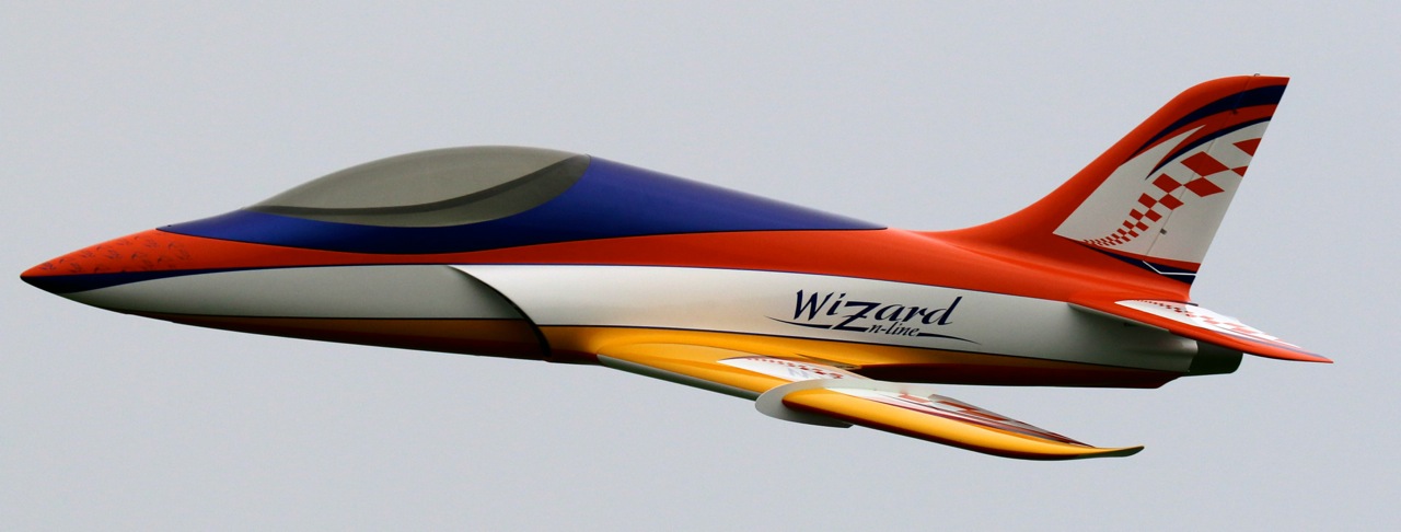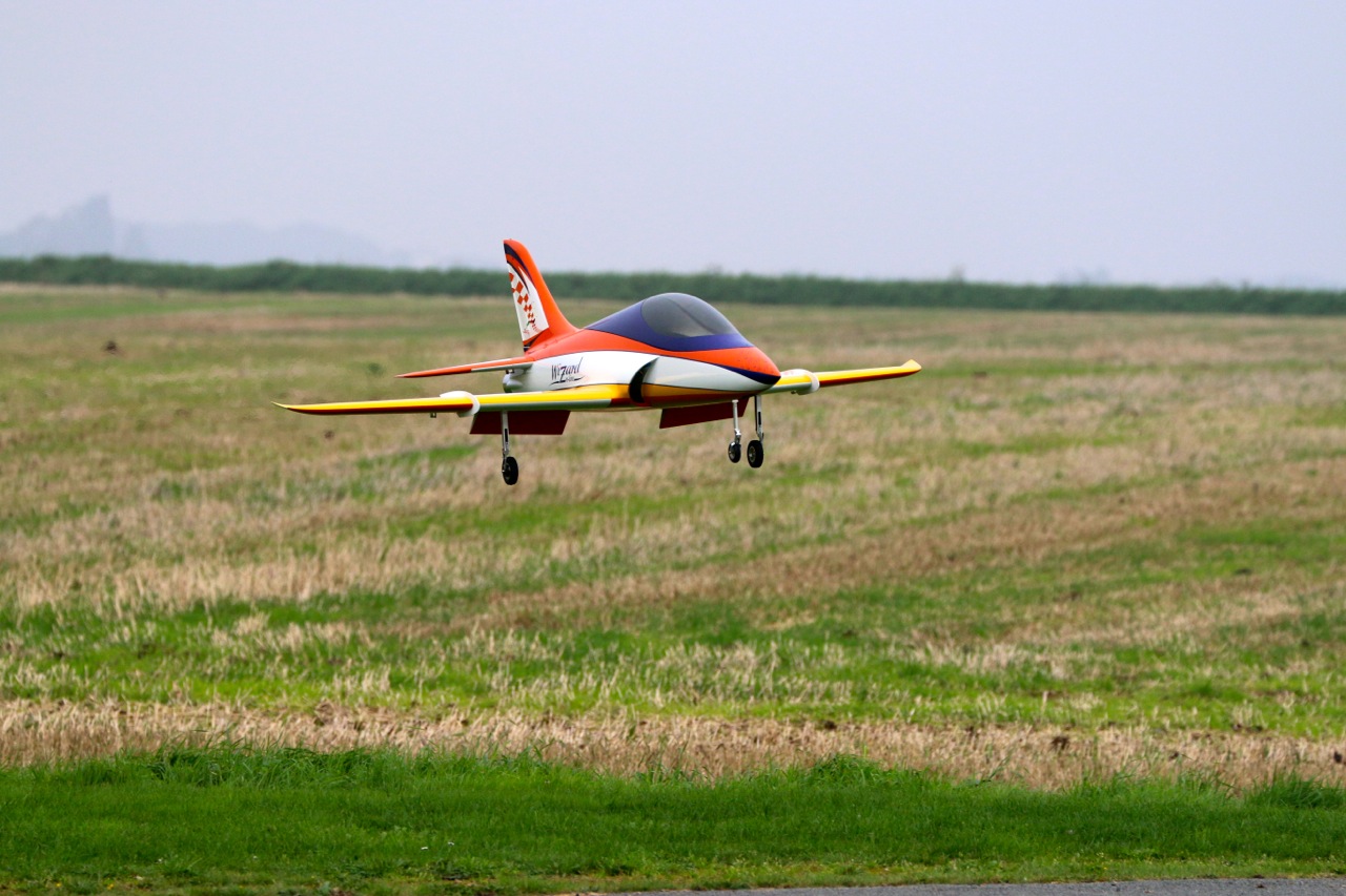 Les 3 premiers vols du Wizard se sont déroulés aujourd'hui. Le décollage est sans problème avec le 1er cran de flap, quelques hippodromes pour ajuster les trims, tester l'effet des flaps, le tout résultant à 2 crans de trims à cabrer à la profondeur et l'ajustement du mixeur flaps -> profondeurs pour le 2ème cran de flap. Ca vole très bien, l'avion a une très belle trajectoire et il est très maniable. On se sent très vite en confiance pour enchainer un peu de voltige jet et les passages bas. La motorisation est parfaite le 140XBL délivre suffisamment de puissance. L'atterrissage est vraiment facile, 1er cran de flap en vent arrière et 2ème cran dans le dernier virage, on laisse descendre, ça freine bien avec les flaps (120mm de débattements) et on arrondi tranquillement. A noter que les freins électrons retracts sont devenus très efficace au 3ème atterrissage avec un léger freinage asymétrique mais contrôlable sans problème.