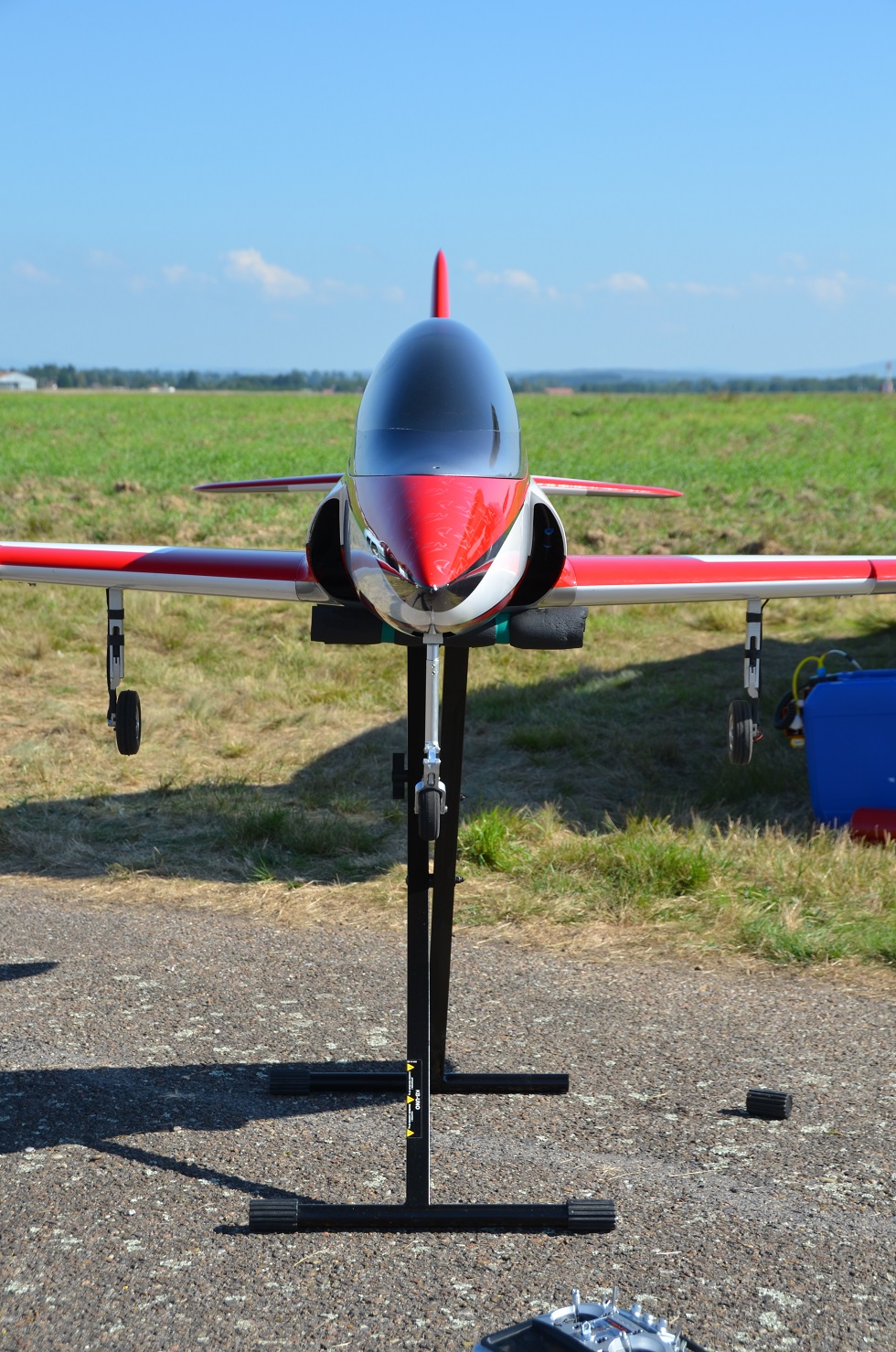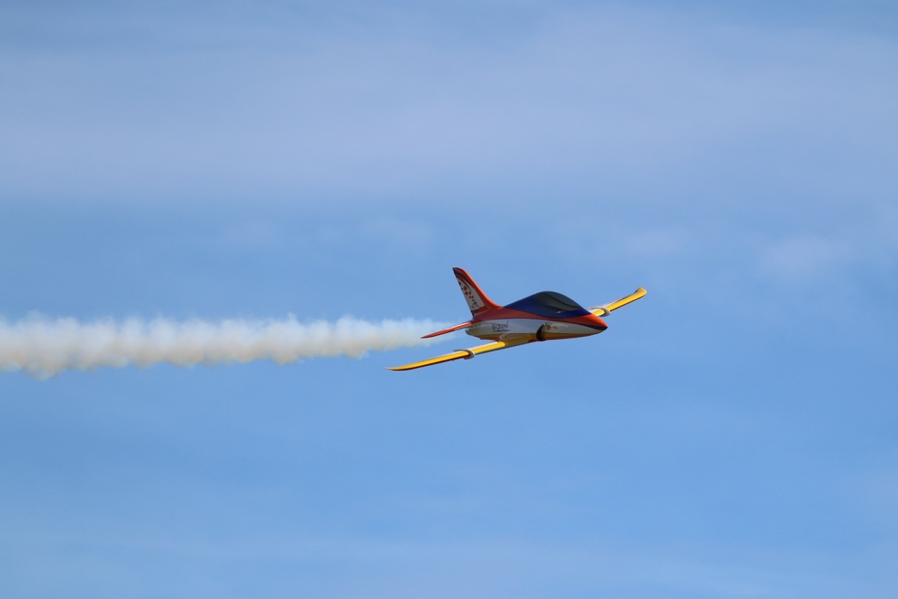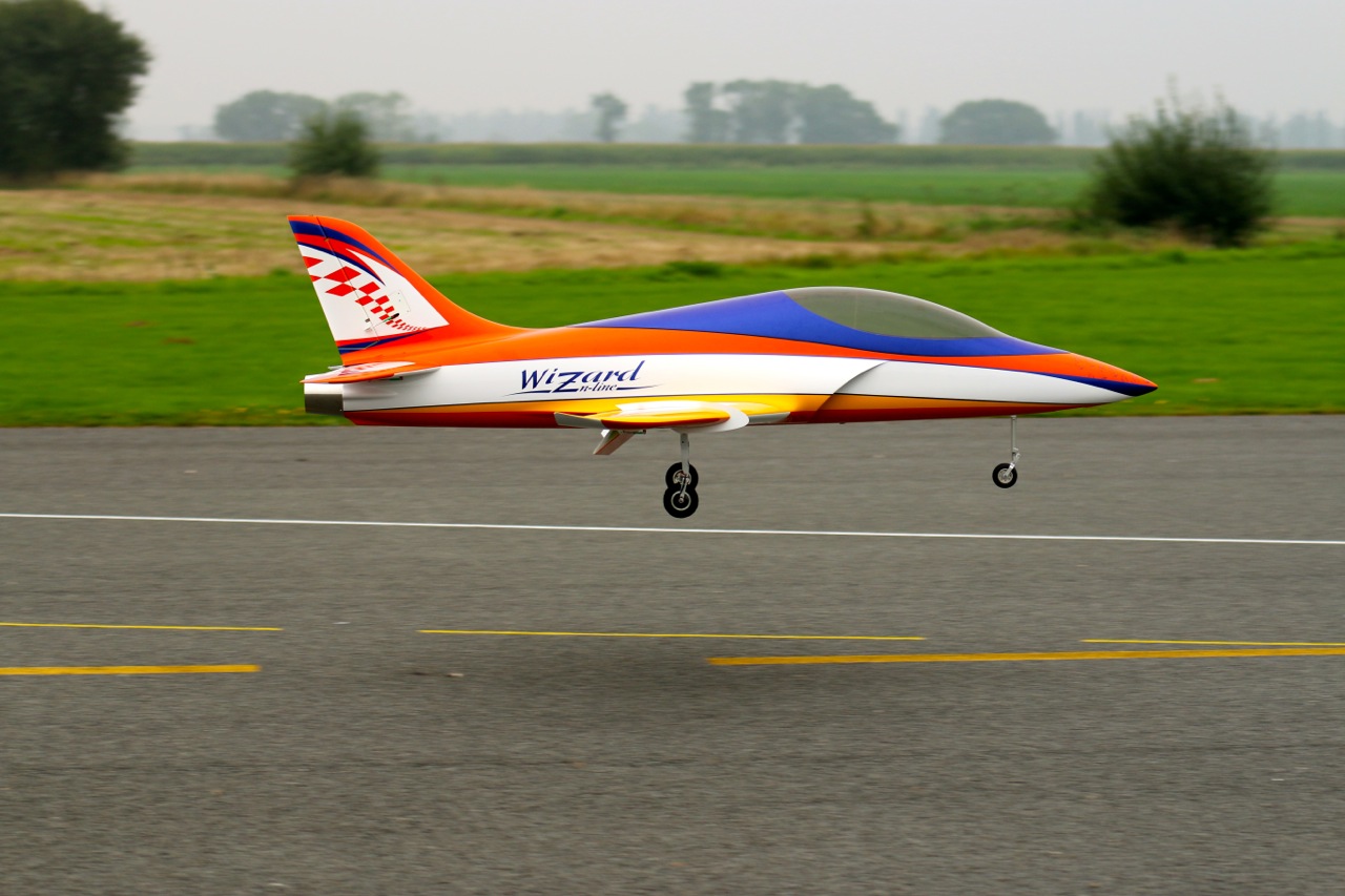Les 3 premiers vols du Wizard se sont déroulés aujourd'hui. Le décollage est sans problème avec le 1er cran de flap, quelques hippodromes pour ajuster les trims, tester l'effet des flaps, le tout résultant à 2 crans de trims à cabrer à la profondeur et l'ajustement du mixeur flaps -> profondeurs pour le 2ème cran de flap. Ca vole très bien, l'avion a une très belle trajectoire et il est très maniable. On se sent très vite en confiance pour enchainer un peu de voltige jet et les passages bas. La motorisation est parfaite le 140XBL délivre suffisamment de puissance. L'atterrissage est vraiment facile, 1er cran de flap en vent arrière et 2ème cran dans le dernier virage, on laisse descendre, ça freine bien avec les flaps (120mm de débattements) et on arrondi tranquillement. A noter que les freins électrons retracts sont devenus très efficace au 3ème atterrissage avec un léger freinage asymétrique mais contrôlable sans problème.