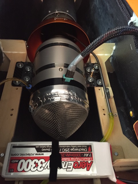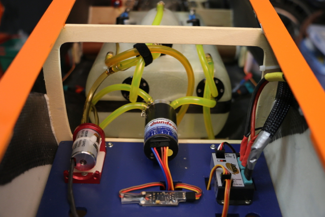 J'ai choisi la pompe à fumigène pour jet de chez PowerBox alimentée directement par la la box compétition. Pas besoin de vanne avec la pompe PowerBox, contrôle proportionnel du débit avec un mixeur entre voie gaz vers voie pompe. Le tout commandé avec un inter M/A couplé avec une fonction logique sur l'inter du train (pas de fumigène si train sorti).
