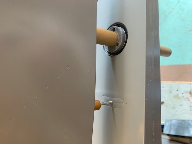 J’ai trouvé simple de coller d’abord le couple sur le croupion puis ensuite par l’accès possible à l’arrière du fuselage de pouvoir positionner finement l’autre couple et régler le serrage des vis pour le collage.