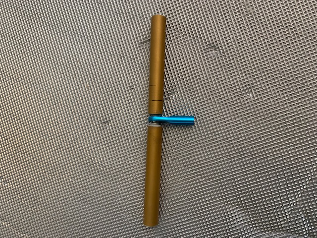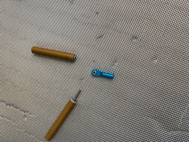 L'axe de charnières est maintenu en place par une vis type vis de bague d'arrêt soudée sur l'axe de diamètre 3mm, que l'on vient visser avec une clé Allen dans la gaine qui fait office de fourneau de l'axe.