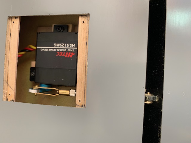 le servo est vissé sur une petite plaque de CTP collé sur l'extrados et donc la trappe sera fixée par 4 petites vis car ne supportant aucun effort.