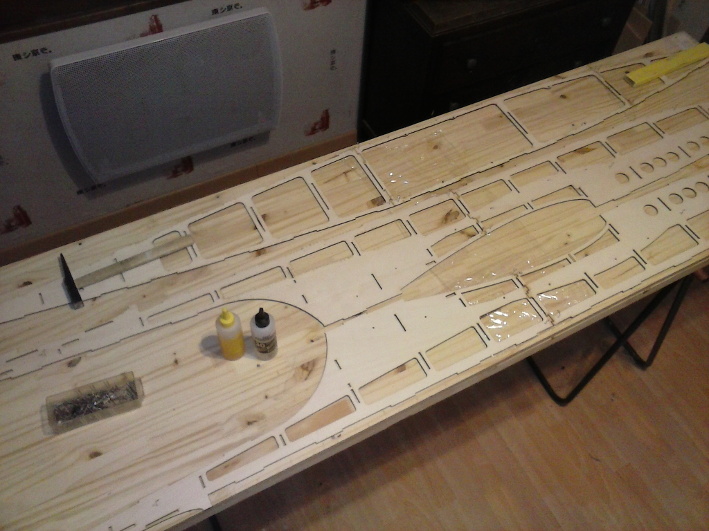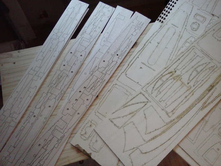 Les pièces sont découpées dans 10 planches de CTP 3 plis de peuplier 40/10 30x100 cm et 6 planches balsa 30/10 10x100 cm. Le balsa est de premier choix, les planches pesant 35 g en moyenne.