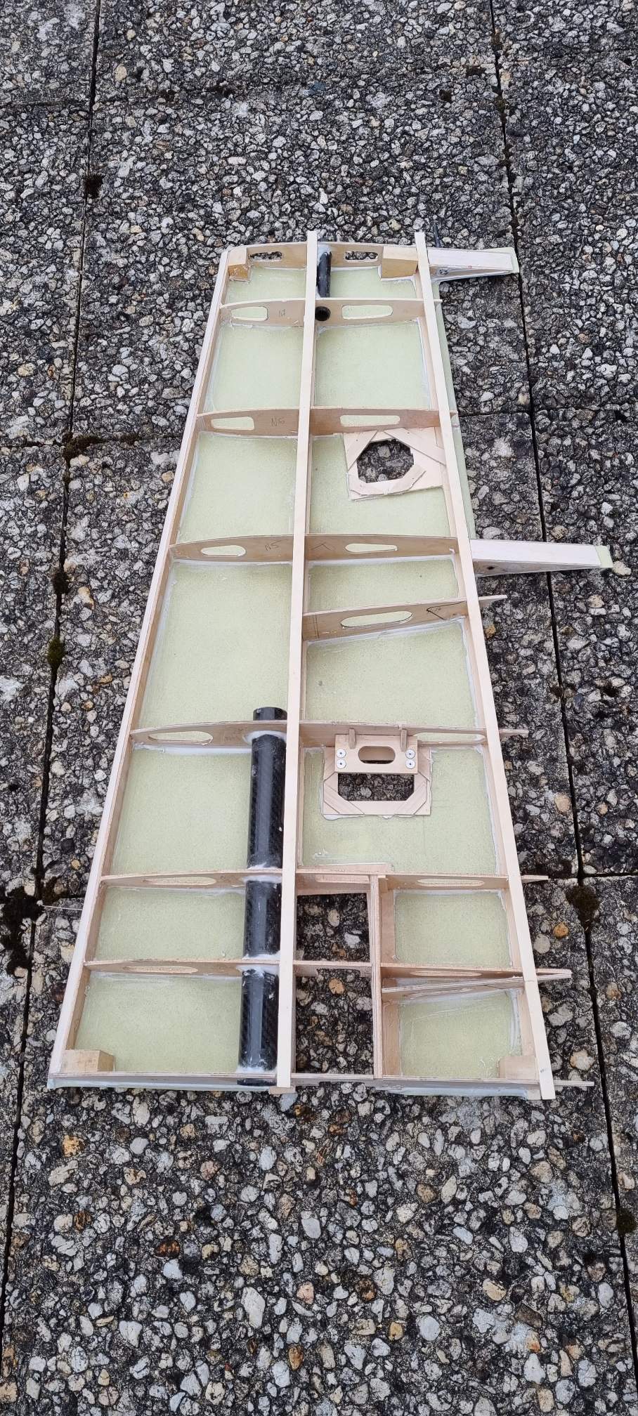 Les premiers essais ont été très prometteurs, même si l optimisation du process a demandé plusieurs semaines. La première peau fabriquée concerne l intrados, l aspect est glacé avec une dureté en surface surprenante pour un poids affiché sur la balance de 274 gr. Cette rigidité permet de réduire le nombre de nervures, l ossature est malgré tout constituée d un longeron en ctp bouleau multiplis de 30/10, comme les deux nervures qui supportent le bâti du train, les autres nervures sont en peuplier de 30/10.