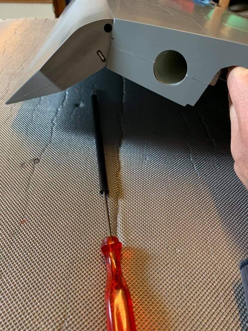 La commande est entièrement cachée et l’articulation prévue par le fabricant se faisant par un axe amovible proche de l’intrados, la commande vient attaquer un axe créé presqu’au centre du volet proche de l’extrados. Cet axe est démontable également.