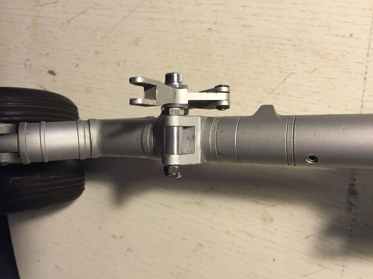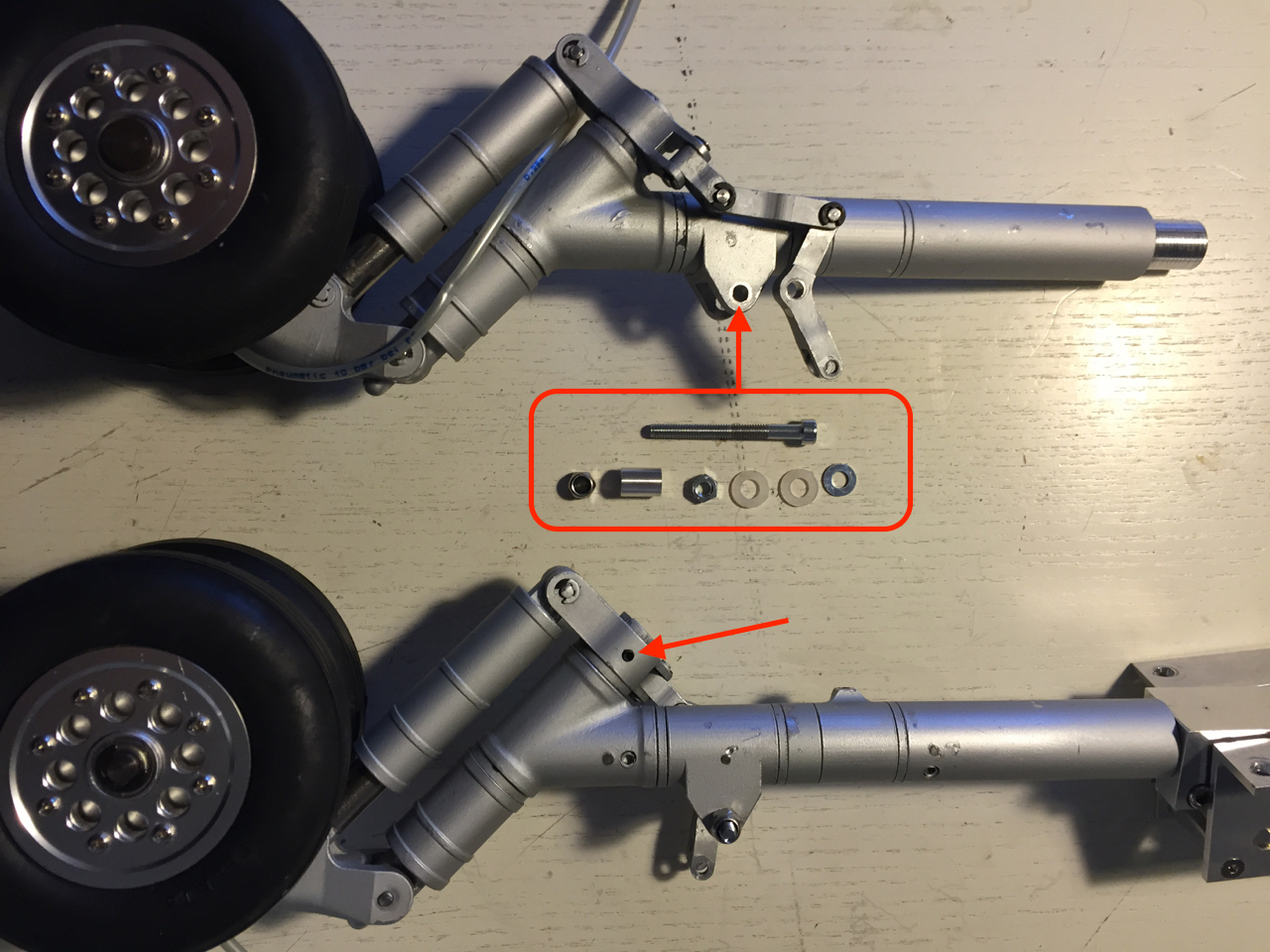 Les problèmes principaux sont les jeux qui s'accumulent dans le train de biellettes qui assurent la rotation du boggie lors de la sortie/rentrée du train. En particulier l'axe constitué à l'origine par une simple vis de 3mm qui nage dans son trou et sur laquelle pivote la biellette principale et également un jeu dans la partie basse du boggie. Avec l'aide mon ami André Golvan, l'axe de rotation cette biellette est porté à 4mm et celle-ci est surélevée ce qui donne une rotation plus souple et sans trop forcer. Quelques clips sont remplacés (qualité chinoise) sur les mini axes des biellettes et une vis de blocage latéral est ajoutée sur la bague qui fait pivoter le cylindre de suspension du boggie.