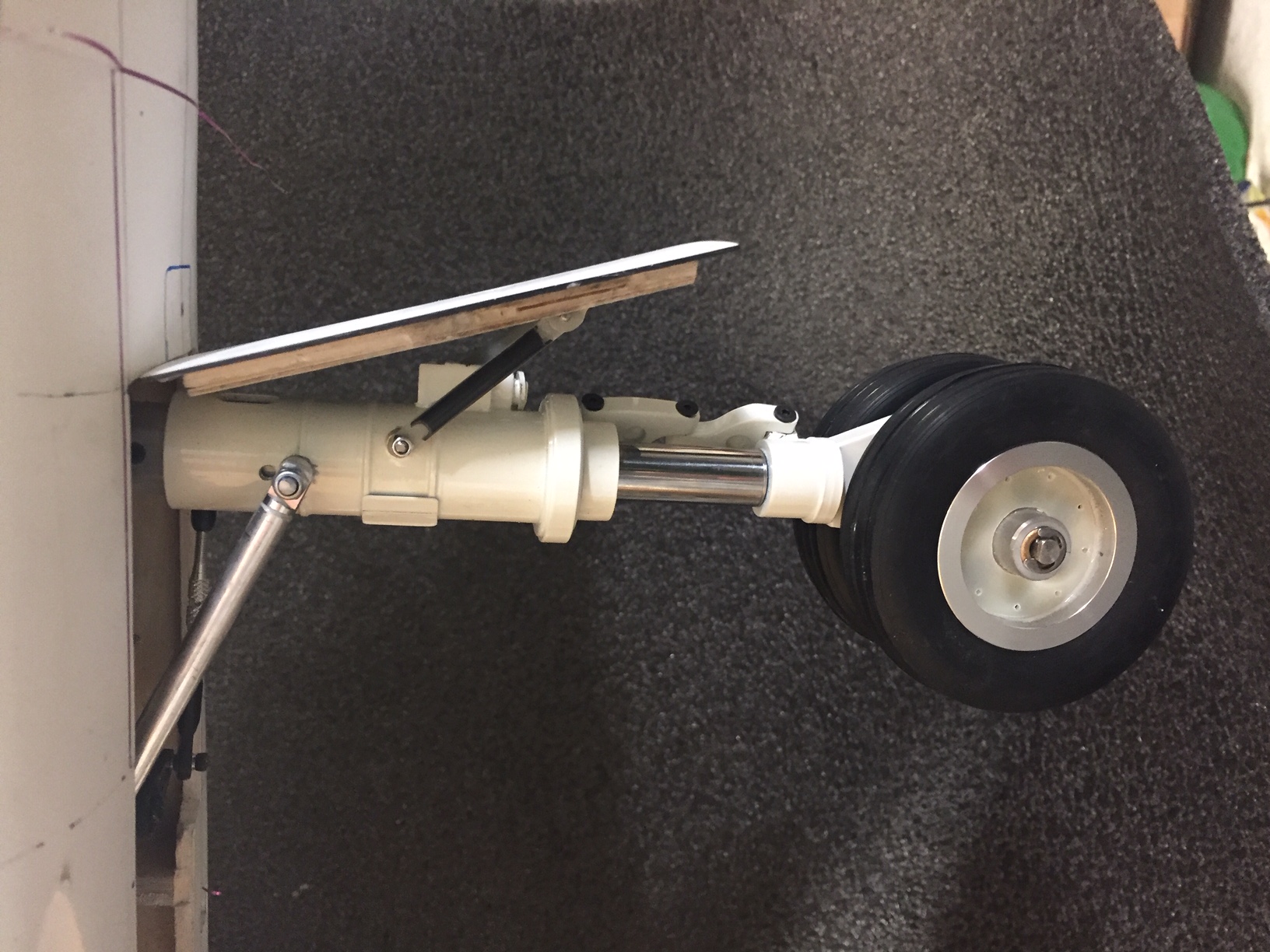 Bonjour à tous, après le premier vol j ai "vidé" le jet et je commence la finition. Aujourd'hui quelques photos du train avant, la difficulté a été de faire la cde de sortie de la trappe frontale par des biellettes reliées à la jambe de train et en même temps laisser la rotation possible de la roue avant. J ai donc réalisé une "chaussette" qui sera empêchée de toute rotation (par le faux vérin) et qui laissera la jambe de train libre en rotation (chaussette libre et sans jeux). Pas facile a expliquer mais quand j'en aurais terminé avec la peinture et les trappes je ferai une petite vidéo. Photos