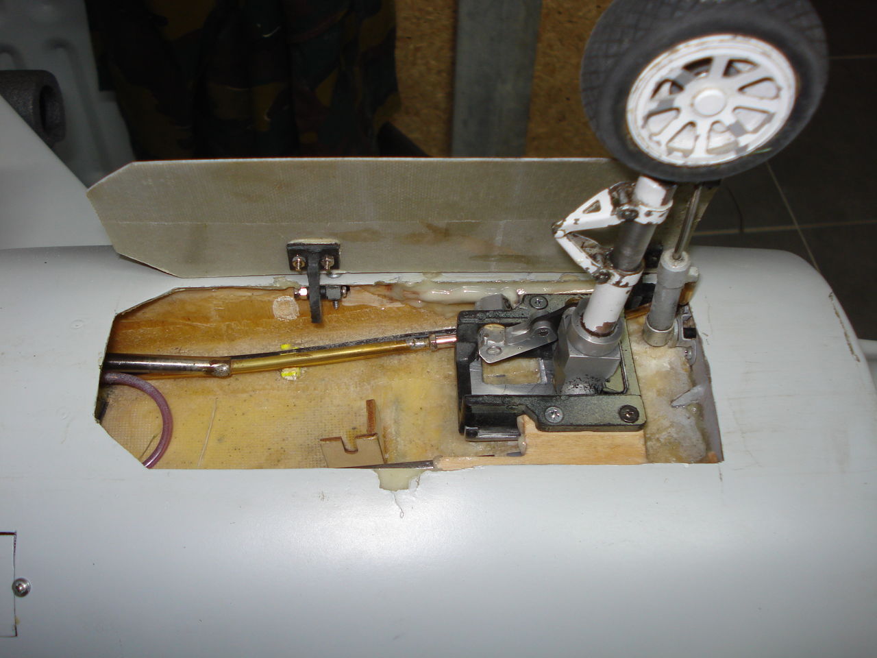 Due to a bad landing the landing gear has broken, repaired but not with original parts (homemade). Formers for nose gear where replaced and reinforced. Nose gear door was remade and repainted, fuselage repaired but not repainted, see pictures.
