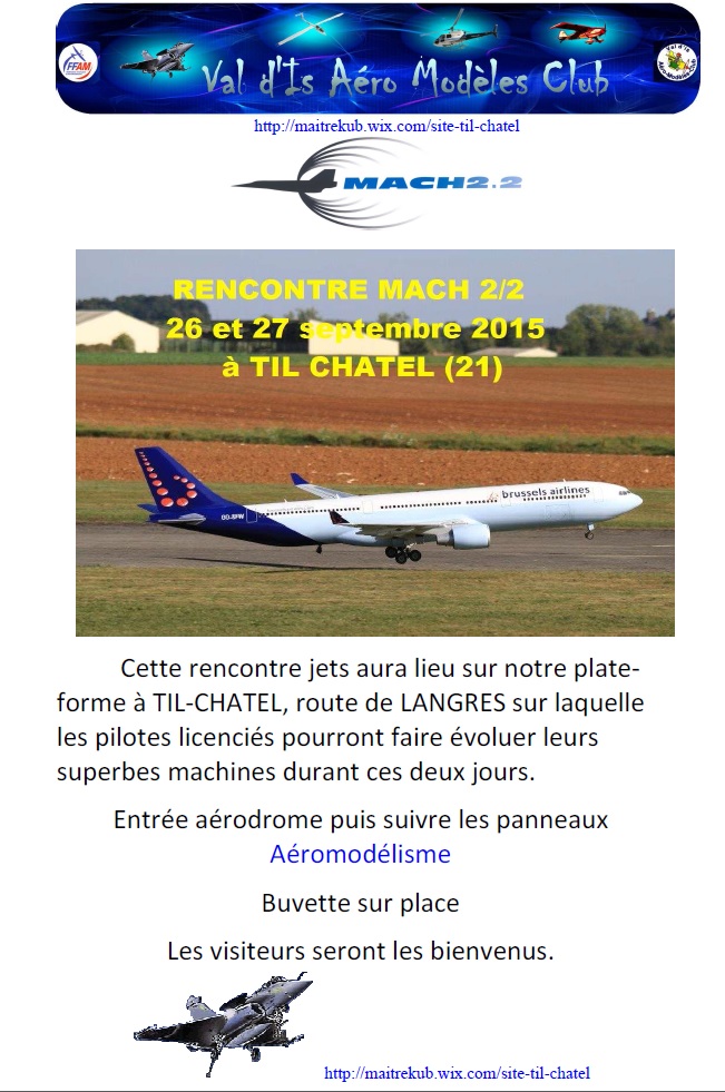 Une rencontre jets Mach 2.2 aura lieu sur notre plateforme à TIL-CHATEL, route de LANGRES sur laquelle les pilotes licenciés pourront faire évoluer leurs superbes machines durant ces deux jours.