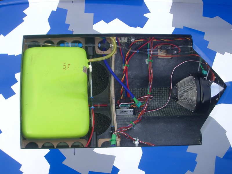 Dans mon fuselage se côtoies : 1 powerbox + son gros interrupteur, 1 ECU et les électrovannes de mon merlin , 1 récepteur (un GR24 Graupner), 2 lipos, 1 module electron e-retract pour gérer le train + les trains électriques.
