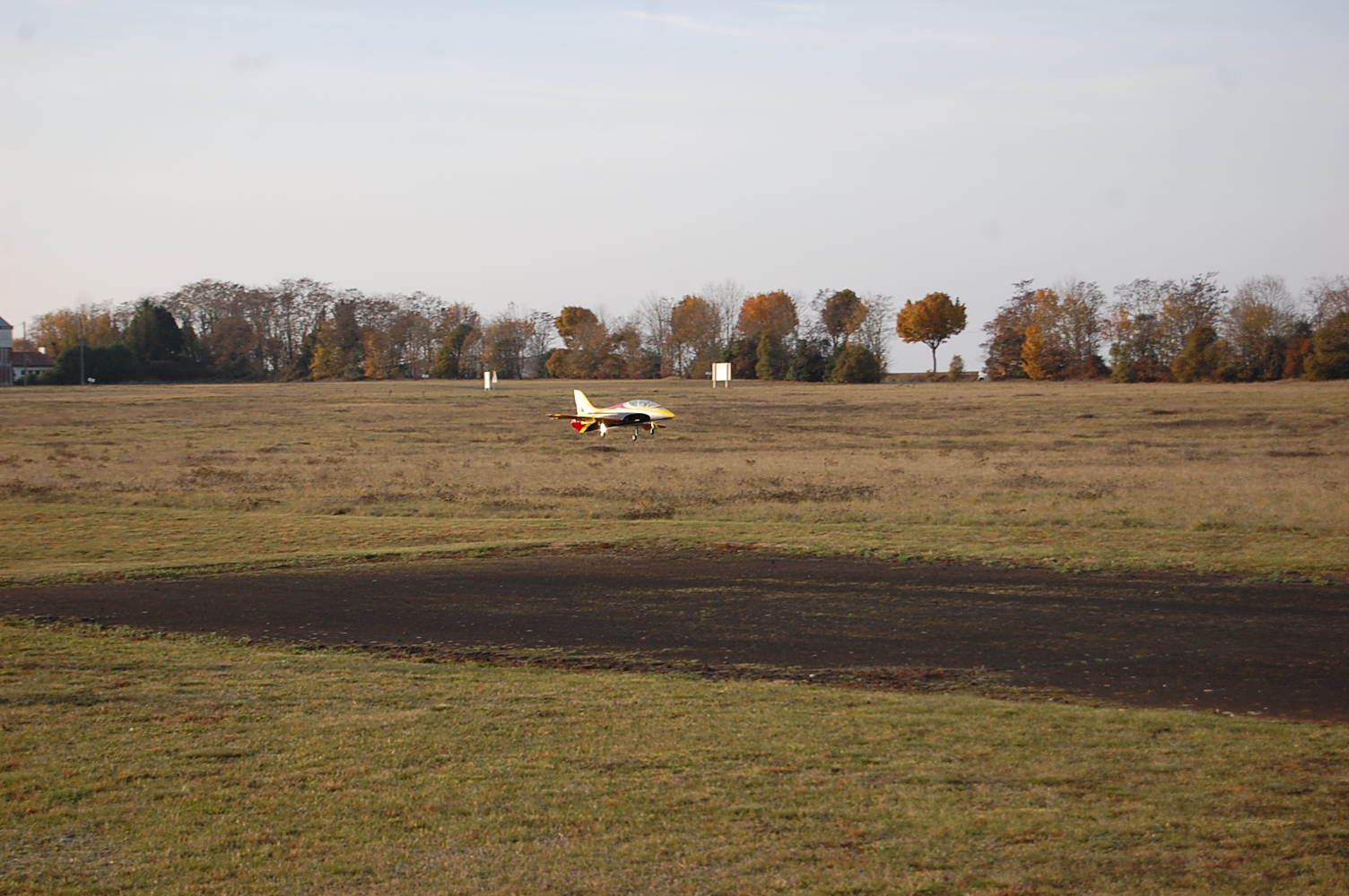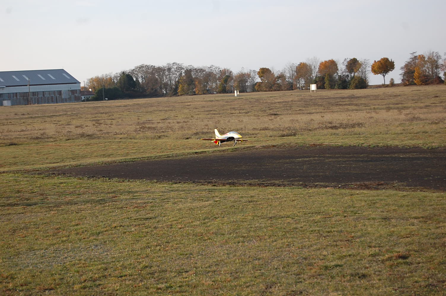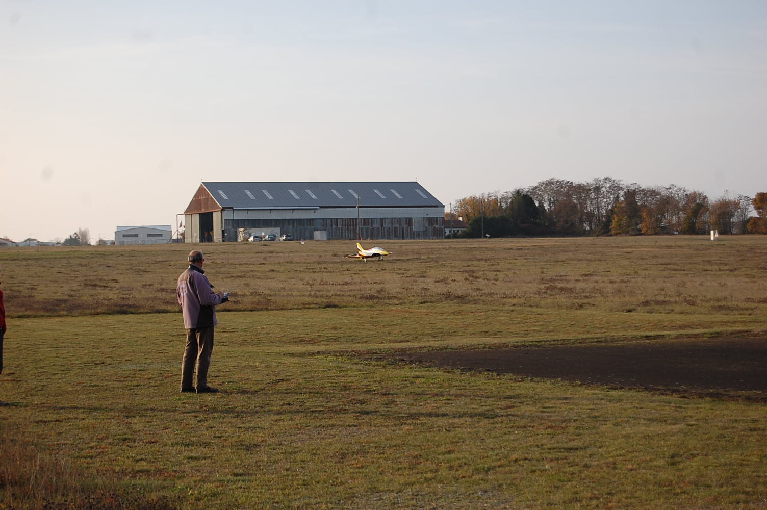 J'avais un peu peur, car il est plus grand que le Habu, pour une masse identique ou presque (3kg5 à l'atterro, soit environ 92g/dm2) mais en fait ça décolle sans souci en environ 50/60m, sans devoir "l'arracher", ça vole bien, certes ça doit pas atteindre des vitesses folles, mais vu notre espace de vol à cet endroit, c'est suffisant. Largement aussi bien qu'un électrique de même taille.