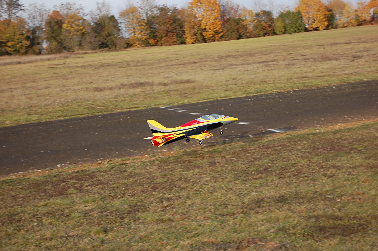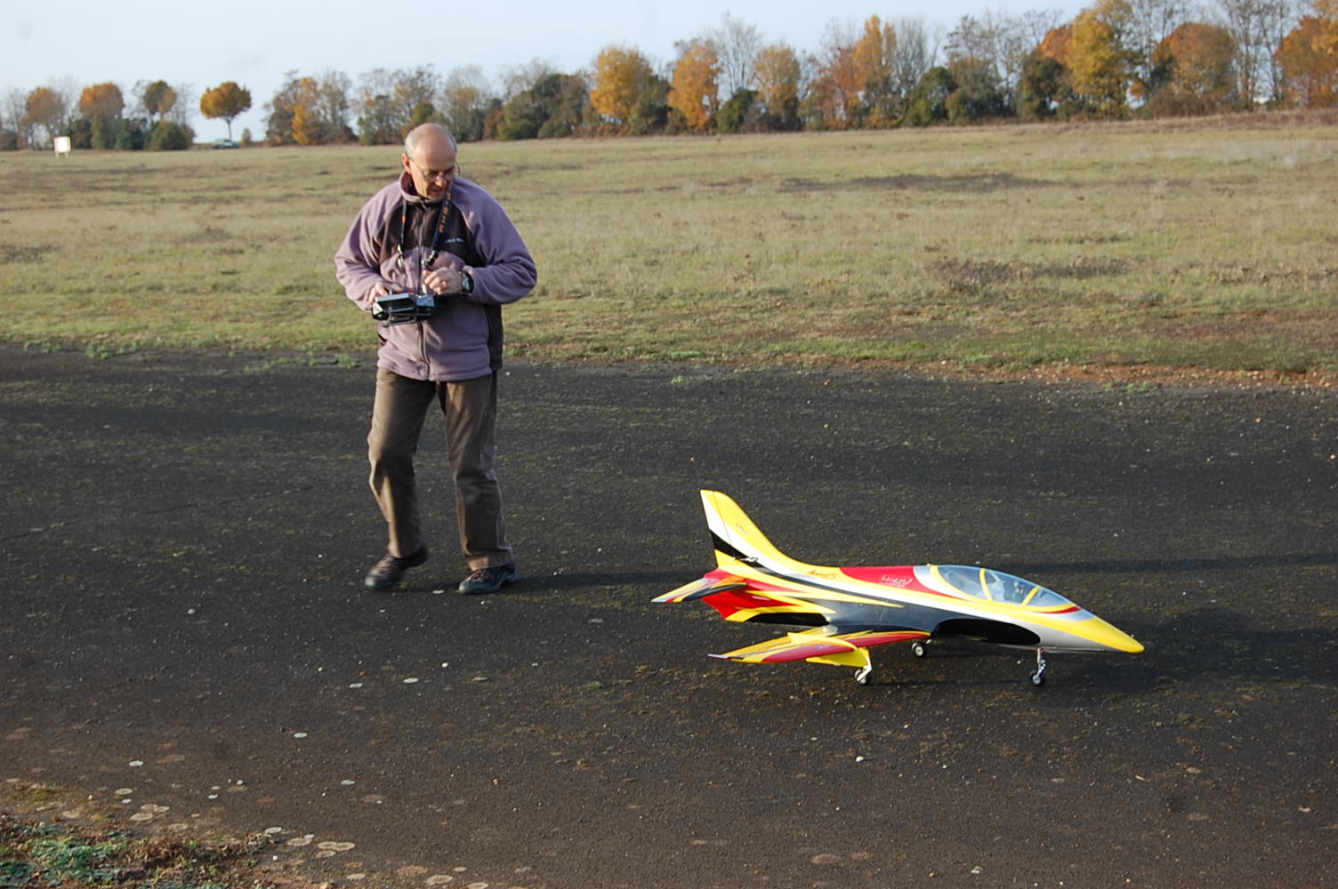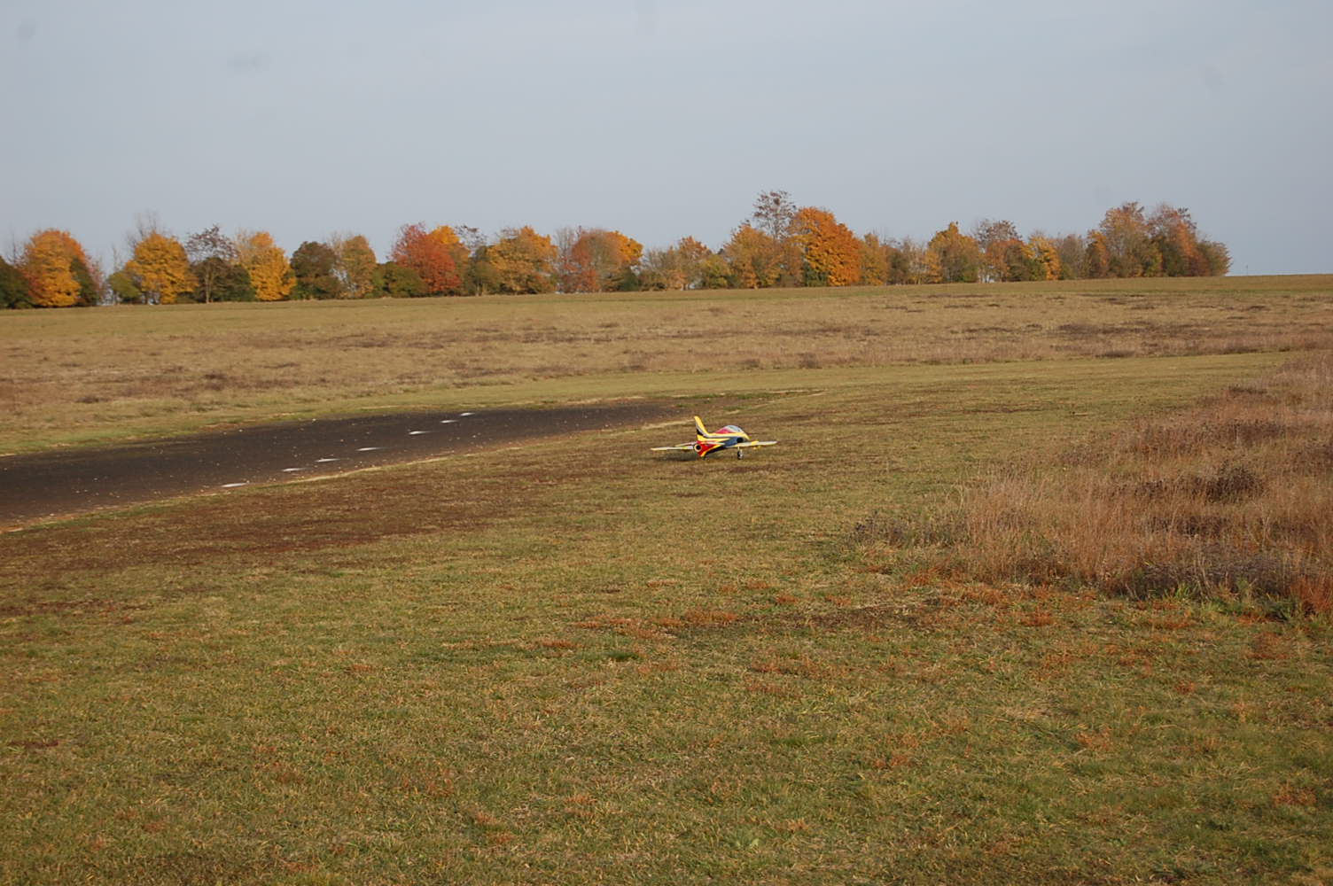 J'avais un peu peur, car il est plus grand que le Habu, pour une masse identique ou presque (3kg5 à l'atterro, soit environ 92g/dm2) mais en fait ça décolle sans souci en environ 50/60m, sans devoir "l'arracher", ça vole bien, certes ça doit pas atteindre des vitesses folles, mais vu notre espace de vol à cet endroit, c'est suffisant. Largement aussi bien qu'un électrique de même taille.