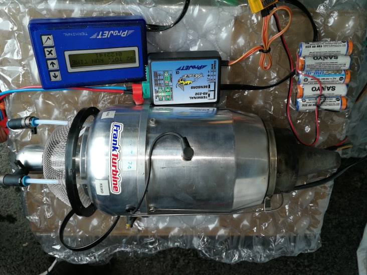 Je vends un Frank turbine tj74 12 kilo de poussée. La turbine a 22 minutes de fonctionnement. Elle est passée chez Frank turbine pour divers upgrade notamment sonde température. Elle a fait quelques demarrages au banc depuis.Jamais remontée dans une cellule.
