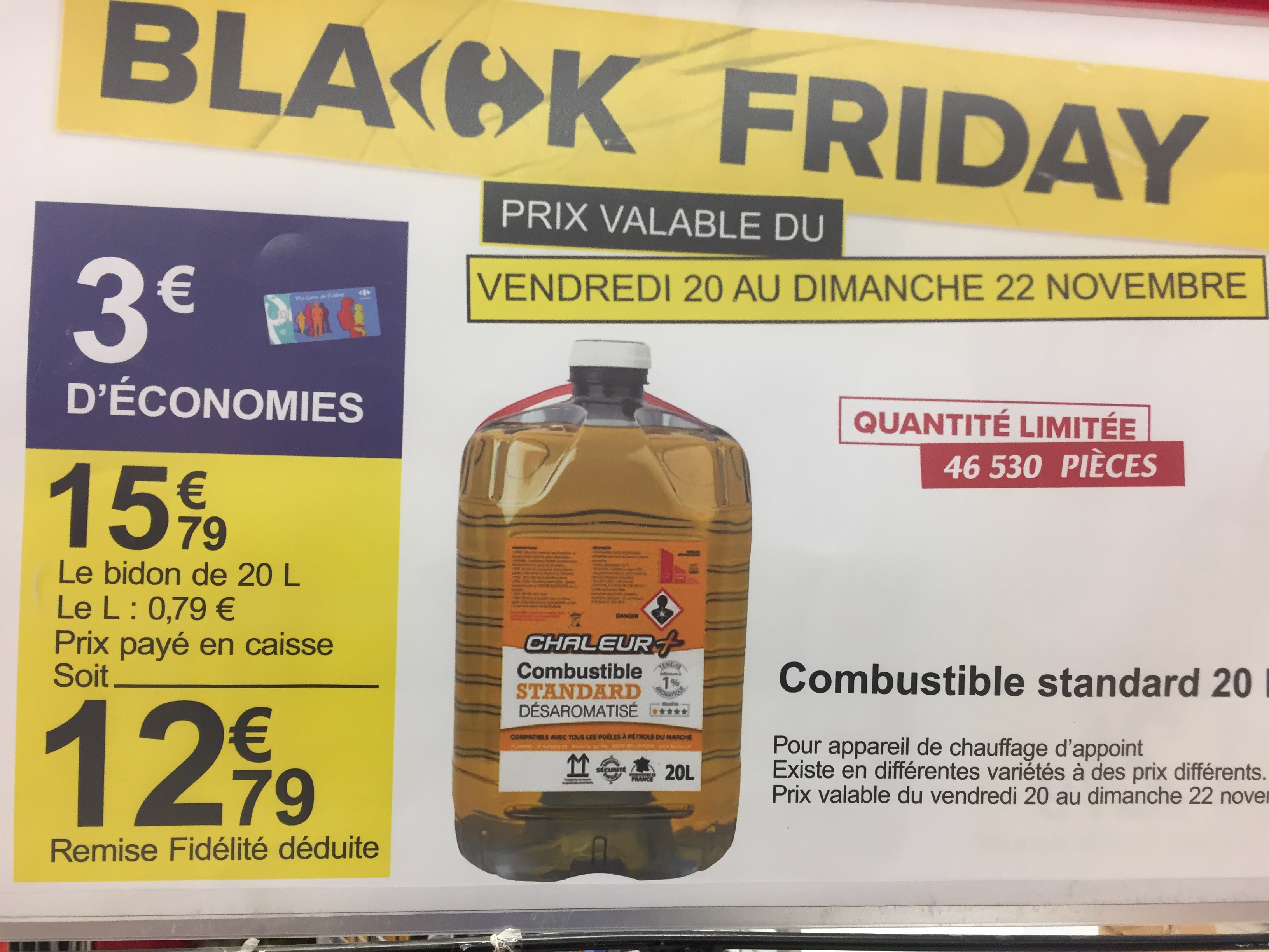 Et bien, pour le black friday, il y a encore mieux chez carrefour. Le bidon de 20l de petrole chaleur plus (usine ptx pour carrefour) est a 12€ est quelques vendredi au lieu de 20. Maos le stock est limité.