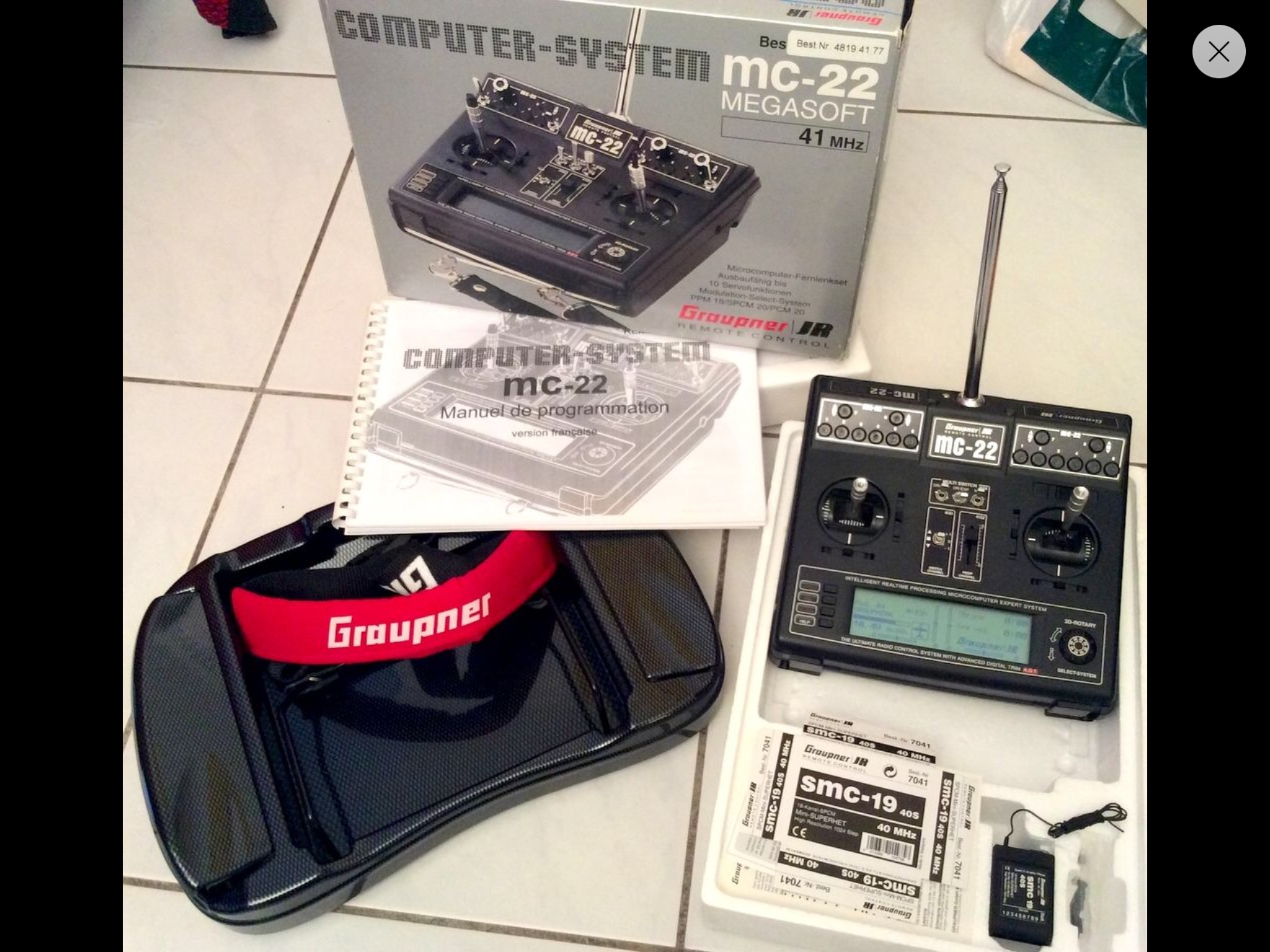 Cette boite contient d’origine la radio avec les manches longs, les grand écran LCD et le bouton « 3D rotatif » de sélection des menus, un accu de 3000 MAh en NiMh, un récepteur SMC 19 en SPCM, les quartz en 41.200MHz (fréquence autorisée en France).