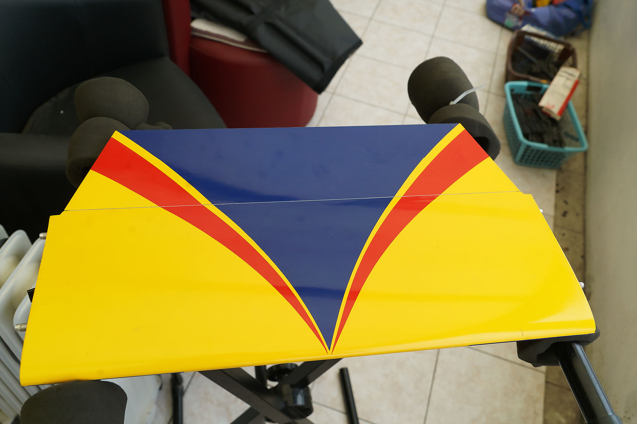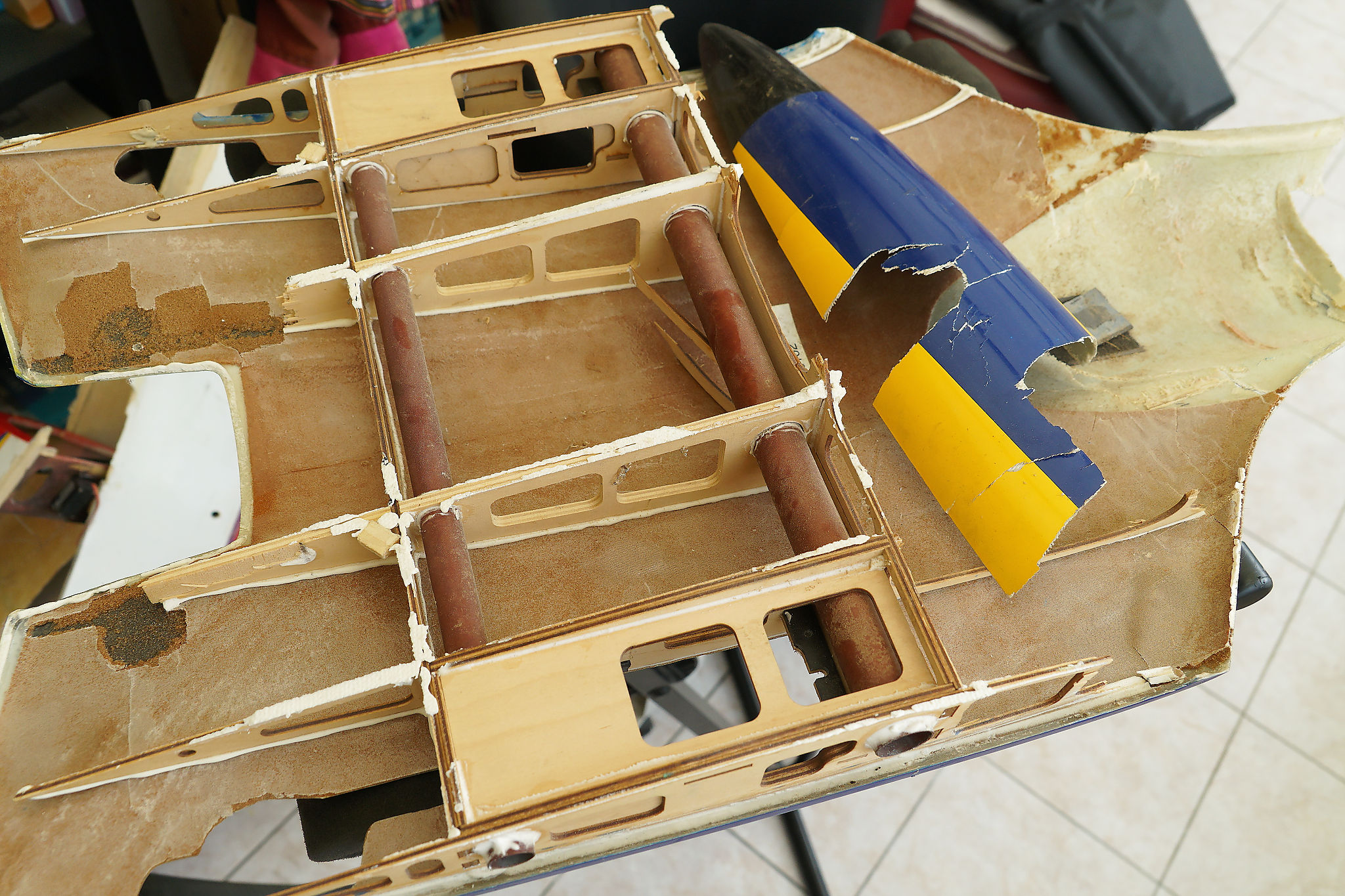 quelques photos et précisions : les réservoirs Kevlar sont OK (un intact, l'autre juste décollé), la radio fonctionne via un HUB4.1 Sbus (une prise unique sécurisée par aile, une prise pour profondeur et directions, très pratique mais introuvable aujourd'hui). Equipements radio : Futaba BLS 272SV aux ailerons et volets, futaba BLS173SV aux dérives, futaba BLS 172 SV à la profondeur