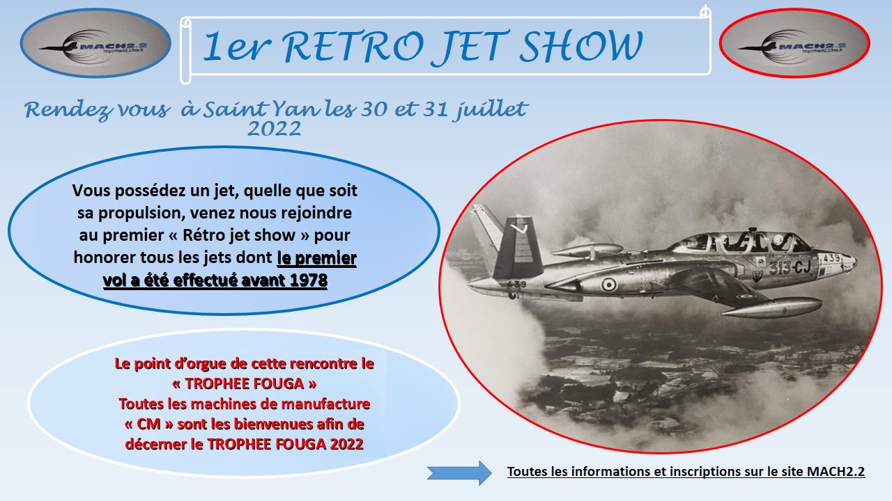 A tous les pilotes de jet retro et particulièrement à tous le pilotes de Fouga, nous vous donnons rendez vous à Saint Yan les 30 et 31 juillet 2022