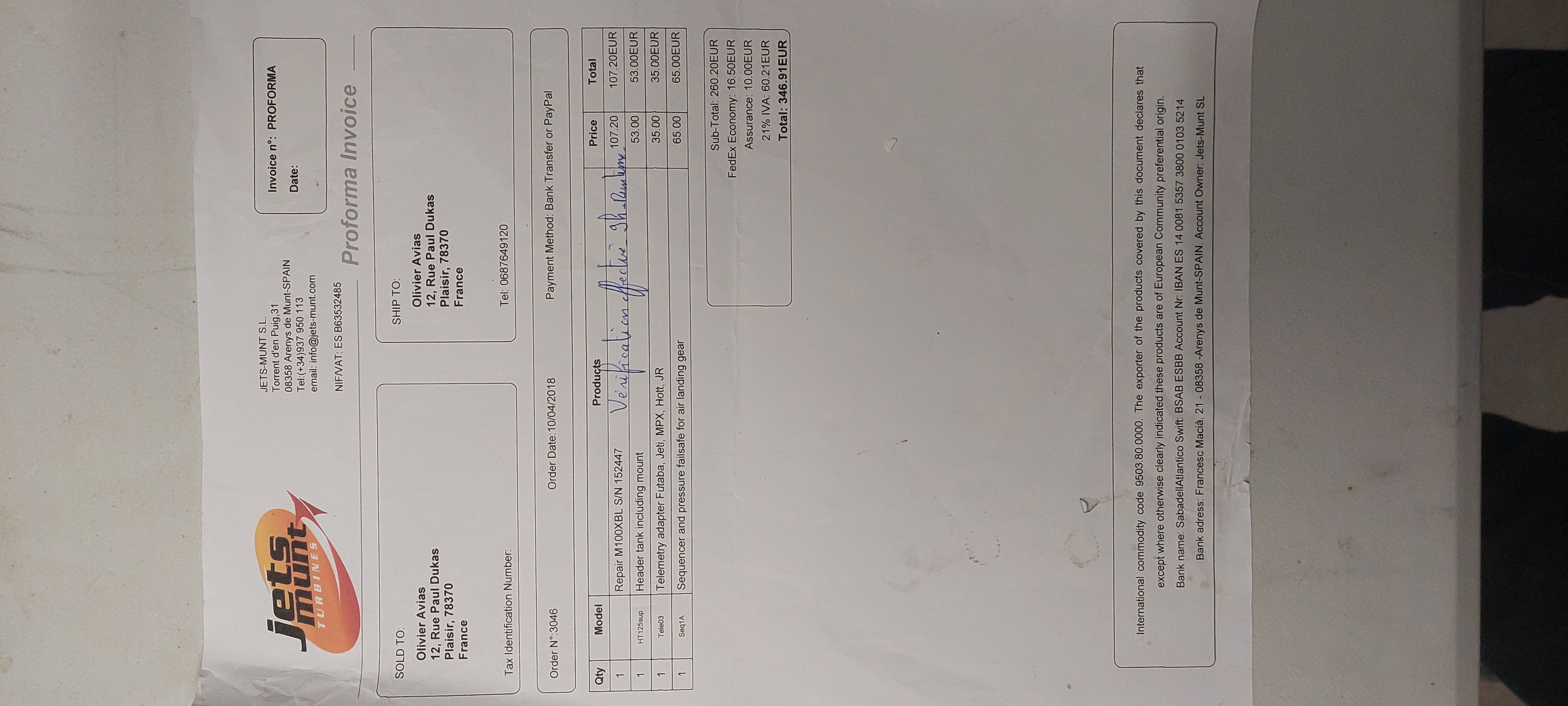 En 2018, vers 9h de runtime, j'ai eu un soucis au premier vol d'un dynamo V1 mal centré (turbine quasi à l'air libre sur cette ancienne version de dynamo) Le corps de la turbine a frotté le sol. J'ai renvoyé la turbine chez Jetsmunt pour check : facture en photo.