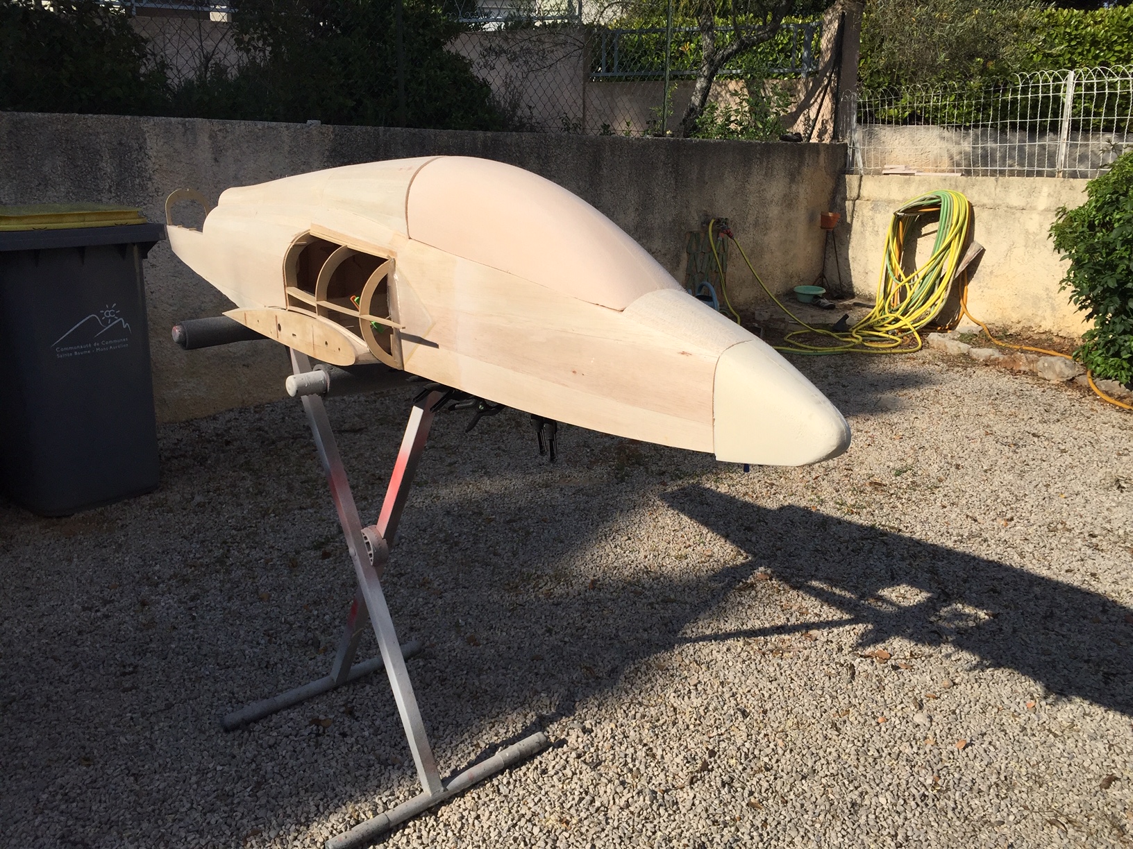 donc j ai sorti le fuselage de son support car le decollement entre le fuse et les entrée d air est d environ 1 cm et je ne me voyais pas fibrer, apreter , poncer etc dans un si petit espace, j ai donc fibrer apreter et poncer avant collage. Le racordement avec la fibre se fera apres et sans difficulté , seule la peinture pourra me donner un peu de fil a retordre.