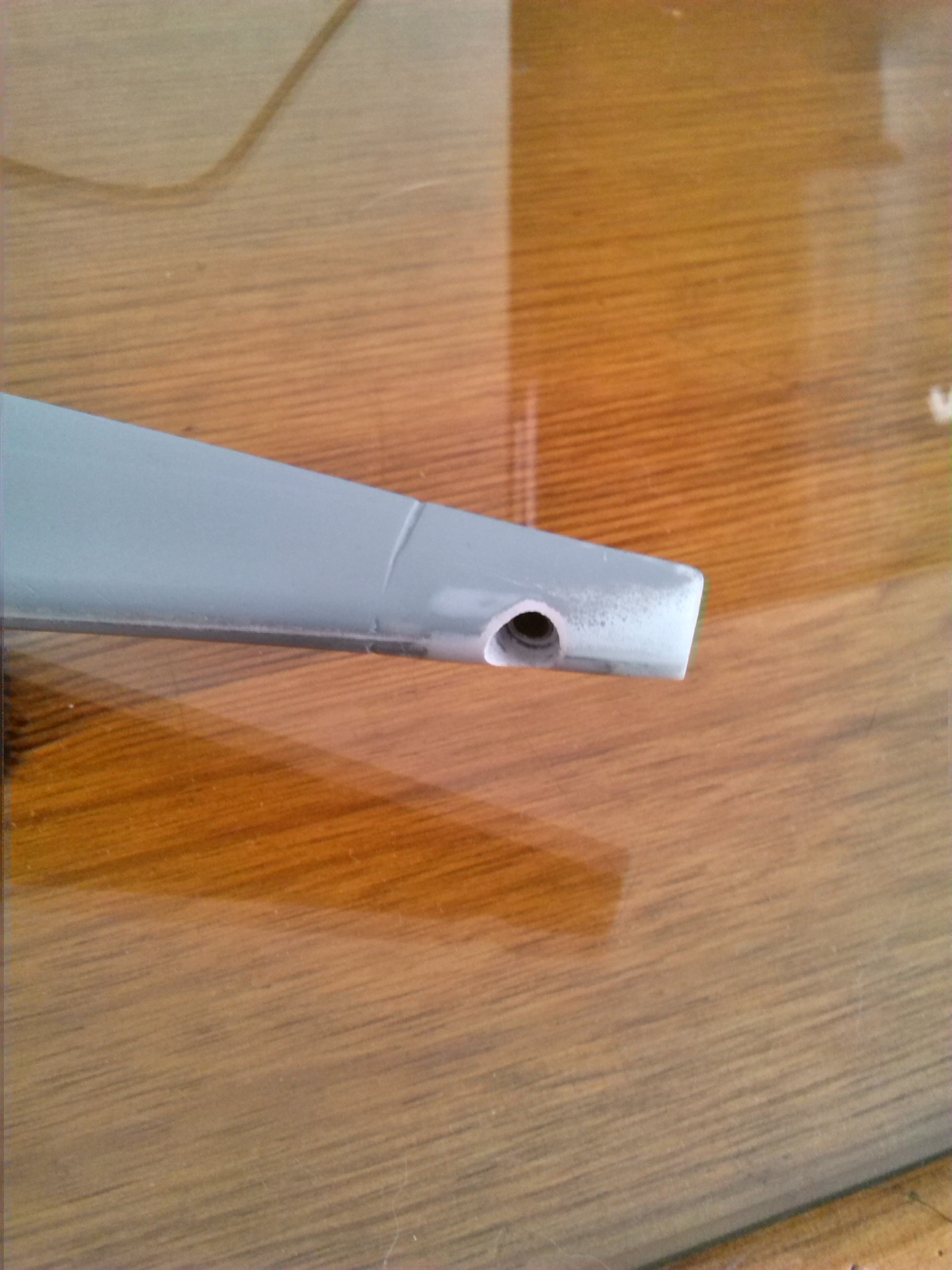 suite à une tentative de tarauder dans le bloc de ctp du fuselage en M3, le taraud étant trop court, je suis passé à la taille supérieure... donc un trou taraudé M4 en travers + une vis M4