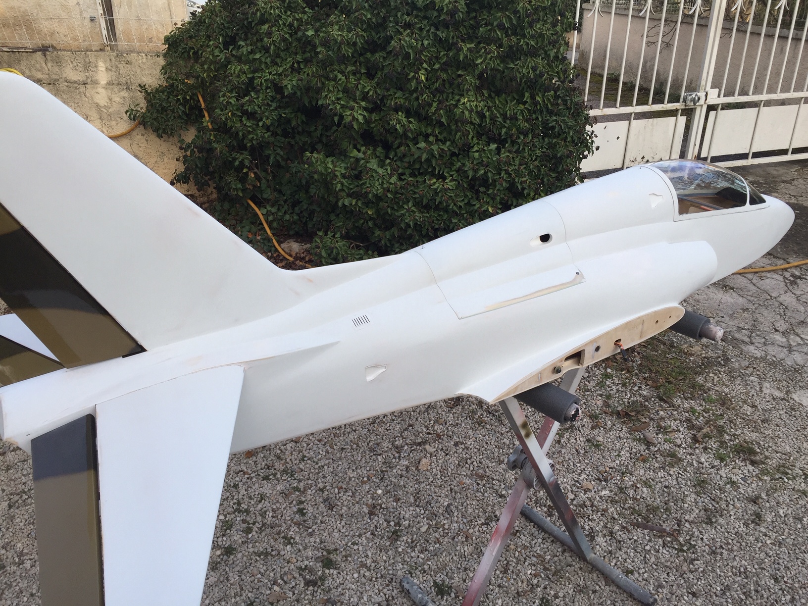 en attendant des jours meilleurs j ai pris la decision de faire quelques entrées d air pour aider un peu la turbine, l avion prendra 50grs tout au plus et ca donnera un peu de relief au fuselage. Je me suis inspiré du reel pour l emplacement et les formes. Photos