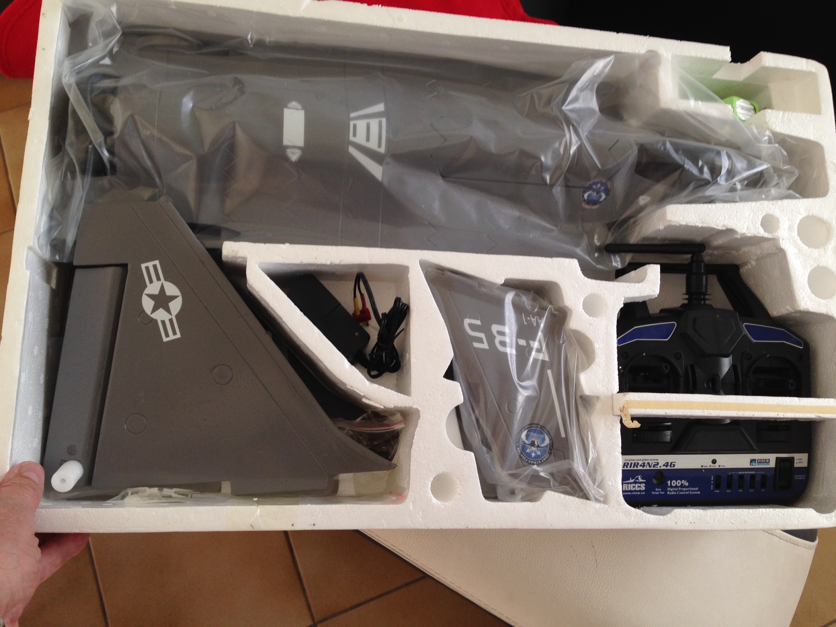 Vends jet électrique FW 35 lightning en EPO, complet avec radio 4 voies, matériel neuf non assemblé, boite ouverte pour photos, turbine 64mm, moteur brushless 3900 KV, ESC 25A, 2 servos 9g, Lipo 1300 mAh avec chargeur