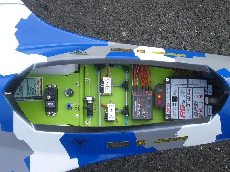 Dans mon fuselage se côtoies : 1 powerbox + son gros interrupteur, 1 ECU et les électrovannes de mon merlin , 1 récepteur (un GR24 Graupner), 2 lipos, 1 module electron e-retract pour gérer le train + les trains électriques.