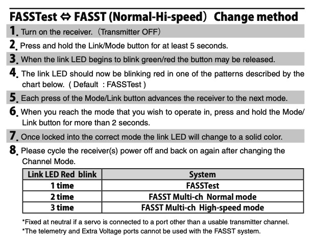 Il faut paramétrer le récepteur pour passer du mode FASSTest au mode FASST, la procédure est bien indiquée dans la documentation.