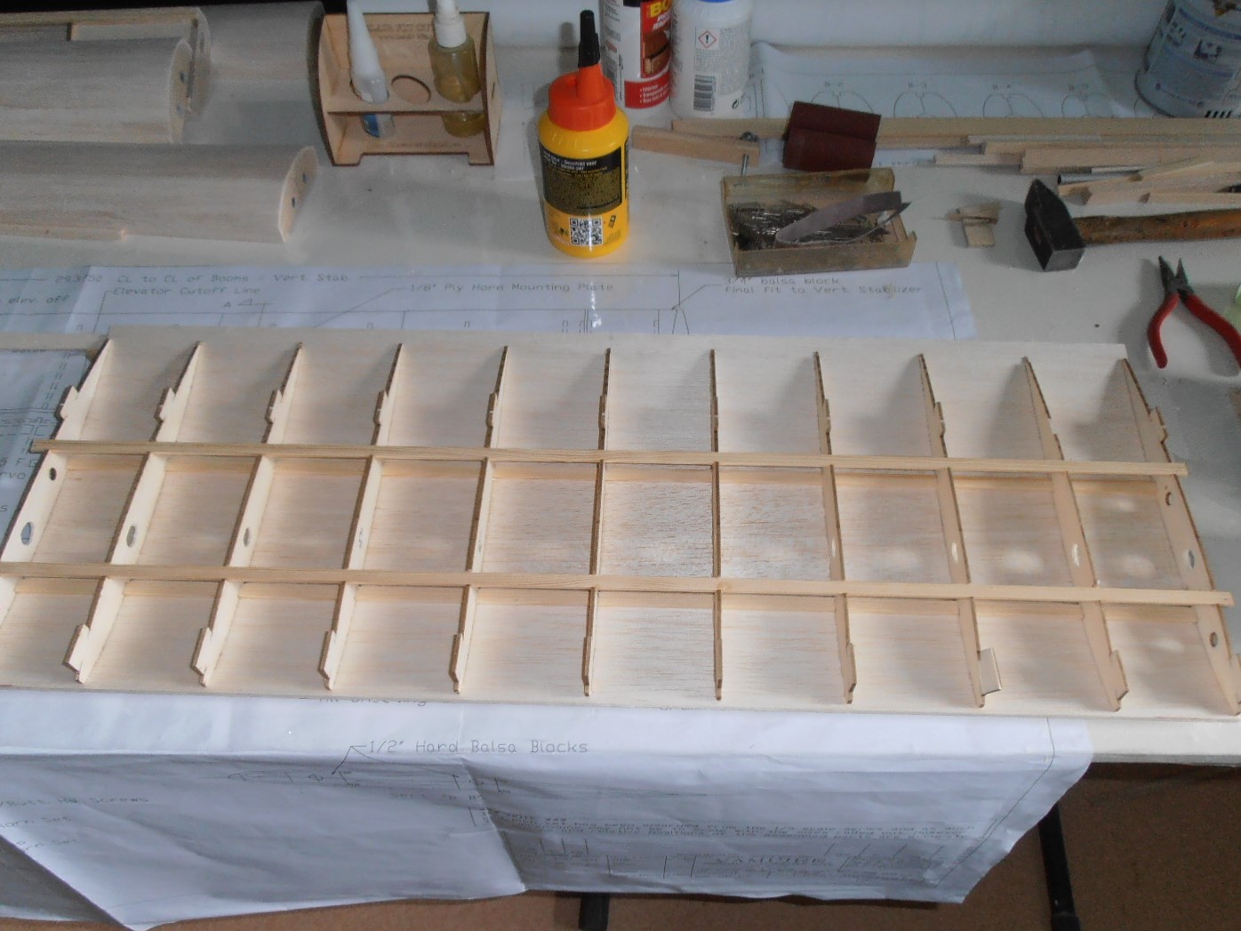 A suivre: finition du coffrage des poutres sur le fuselage. Ensuite finition et entoilage de l'ensemble poutres, dérives et stab.