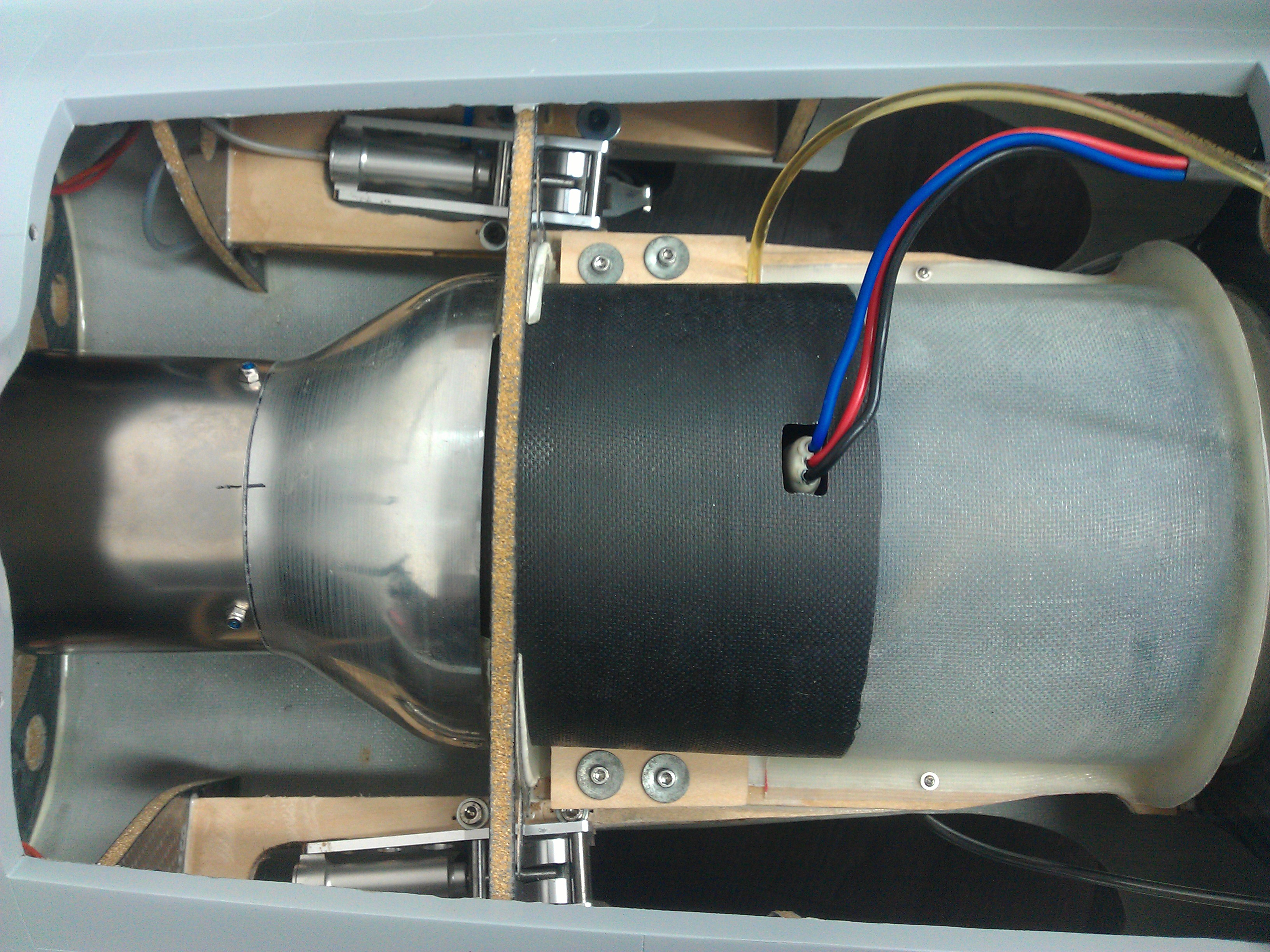 Ceci est monté dans un modèle Produit en PRC avec feutre thermique ajouté à l'arrière. La tuyère a été réalisée par CD "sur mesure" à qui le cône carbone perso lui a été fourni (Il est pas beau l' tuyau CD?). La petite zone "double" paroi n'est là que pour ajuster le diamètre de la Tuyère au couple final du fuselage. Pas mal de vols maintenant et la tuyère reste bien "fraîche" (Blanche).