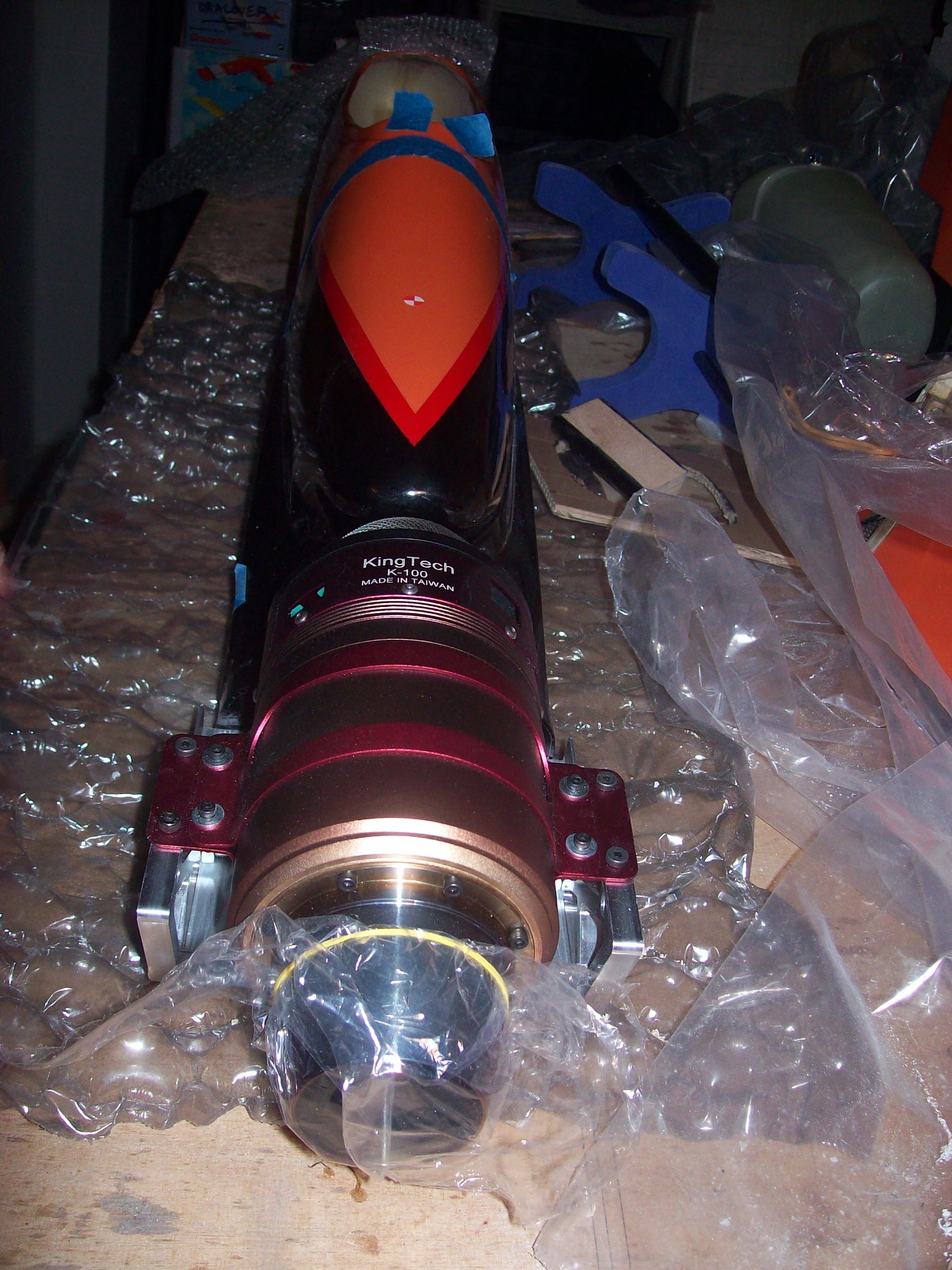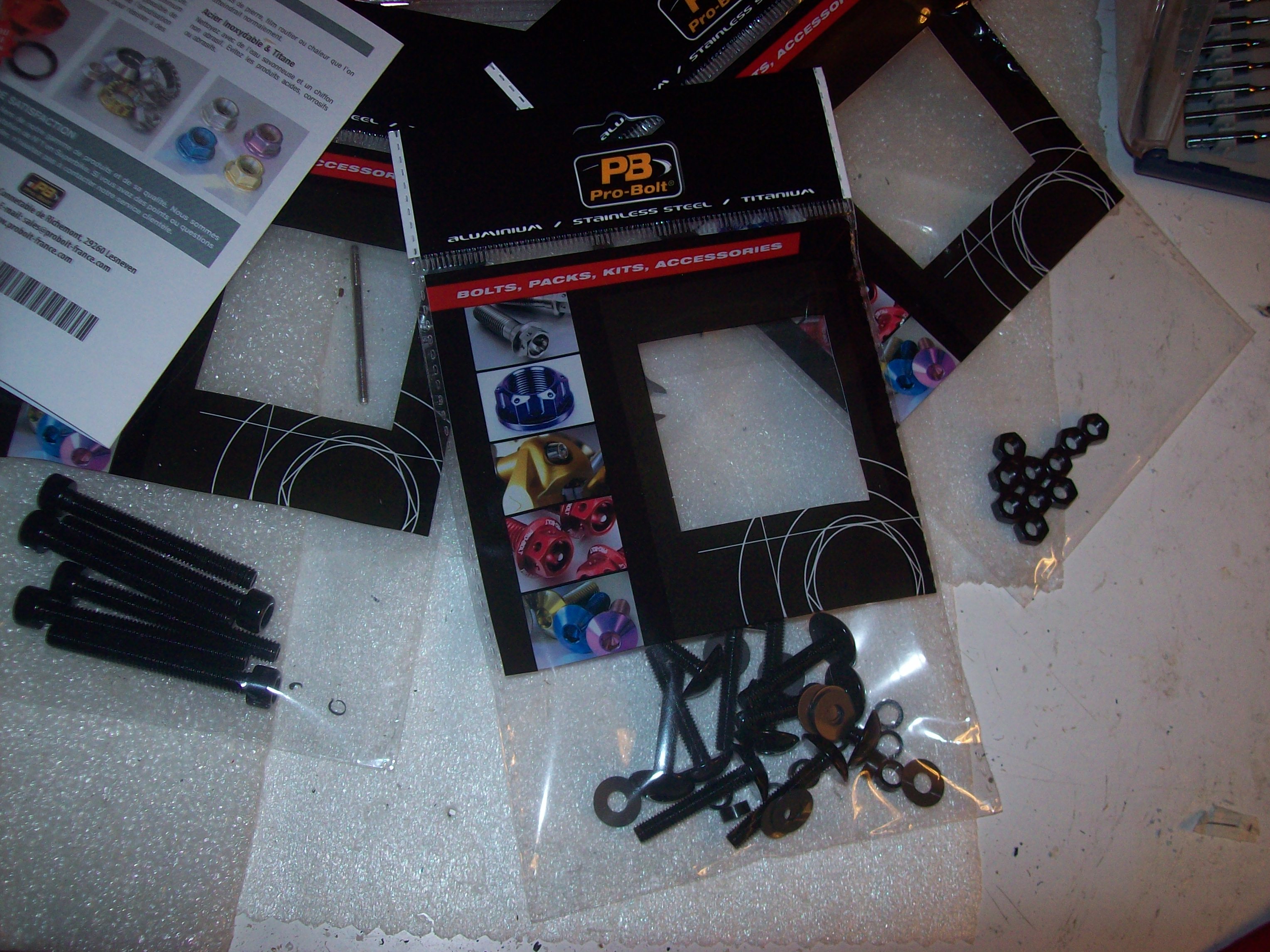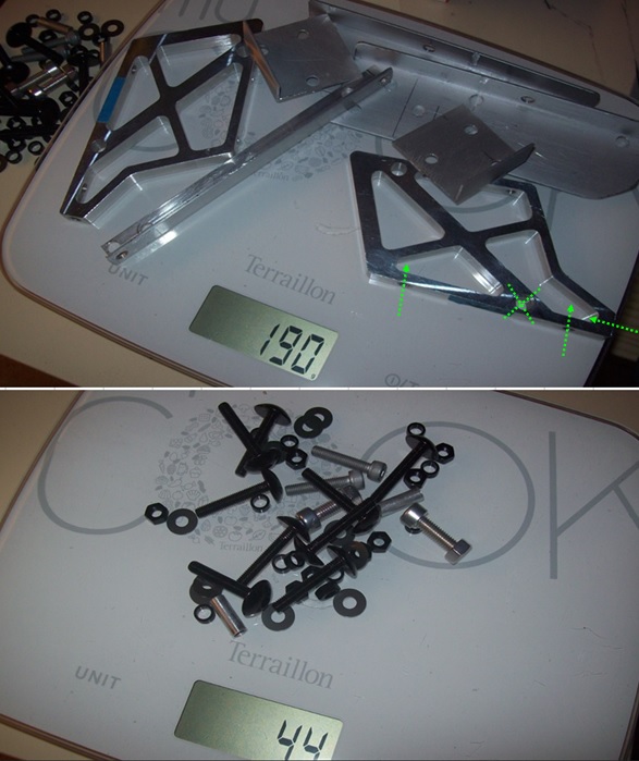 Bâti = 190 gr + 15 vis en alliage (5mm) + 2 latérales 6mm soit 54gr (manque 4 boulons sur la photo) = total de 244gr pour un support robuste pouvant supporter à l'aise la K100G (vis spéciales traitées - robustes et légères -3 fois plus légères que l'acier inox)