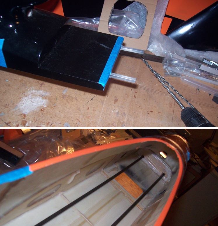 - le plateau est renforcé avec 2 carrés creux en carbone de 6mm (traversant le fuselage avec le plateau) et 10cm d'acier 4mm au niveau du point de fragilisation (plateau/cellule ...à l'intérieur des carrés en carbone) - On peut remarquer que le fourreau de la conduite Carb contribue au renforcement arrière de la structure (carré 6mm en carbone)