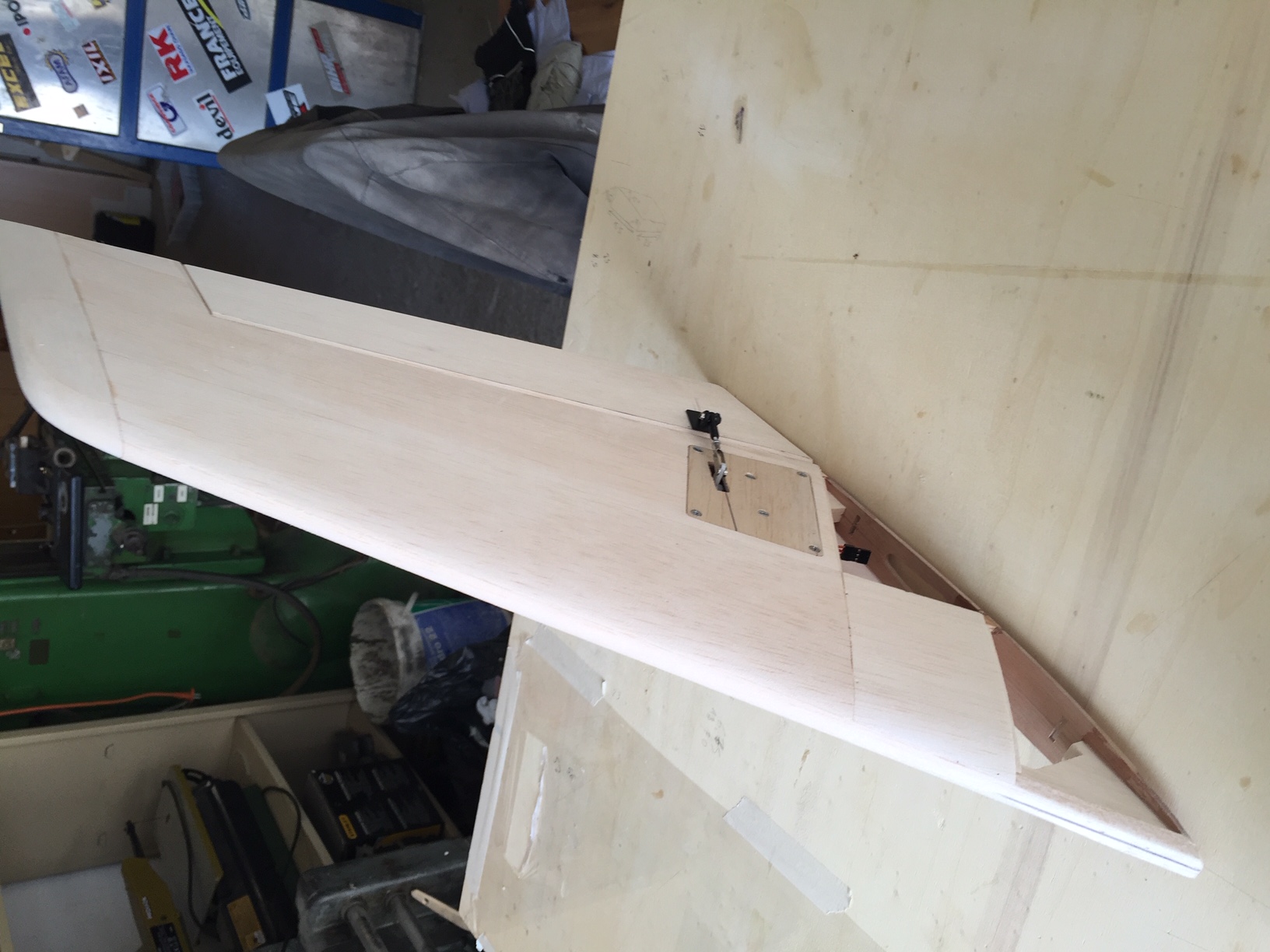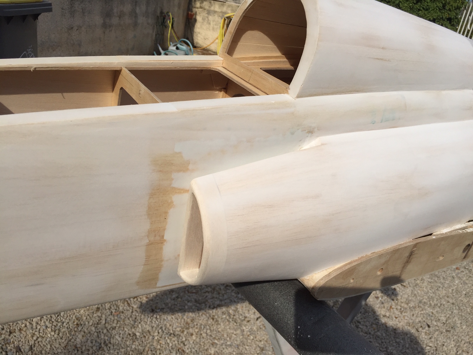 Bonsoir a tous, et oui Gaetan qu elle chaleur, c bon pour la resine, mais trop chaud pour moi :shock: Apres plusieurs magasins impossible de trouver le mastic polyfilla donc commandé sur le net et reception fin de semaine si tout va bien. En attendant j ai mastiqué tout le capot avec mon premier pot, et bonne surprise ca se ponce plutôt bien et durcit considerablement la surface (j ai meme pensé a aprêter directement sans passer par la case fibrage), je peut travailler facilement les arretes et les formes arrondies. J ai fini le fibrage de la derive et le poncage de la gouverne, reste le poncage de la derive (fixe). Photos