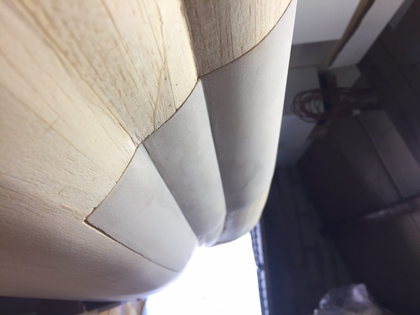 bonsoir à tous, aujourd hui fibrage de la derive, j ai essayé un truc pour moins galerer pour poser la fibre: je decoupe la fibre necessaire et je colle un scotch sur le pourtour pour qu elle ne se deforme pas ( elle est tres fragile) c est mieux. Ensuite je cherche le bon mastic, j ai utilisé le hobbylite jusque là et pour les surfaces planes c est pas mal (ca me sert essentiellement comme bouche pore), il faut appuyer dessus fort pour le mastic adhere bien (n oublions pas qu il fait tres chaud ce qui explique peut etre cela) par contre quasi impossible pour rattraper des defauts et le poncage une galere. J ai pris du toupret (voir photo) qui est tres cremeux facile a appliquer, mais qui a un aspect rugueux (je verrais au poncage comment ca se passe), il est tres leger, demain j irai acheter du polyfilla sans poncage qui a l air plebicité sur le net..( a voir, le hobbylite est aussi plébicité). Photos