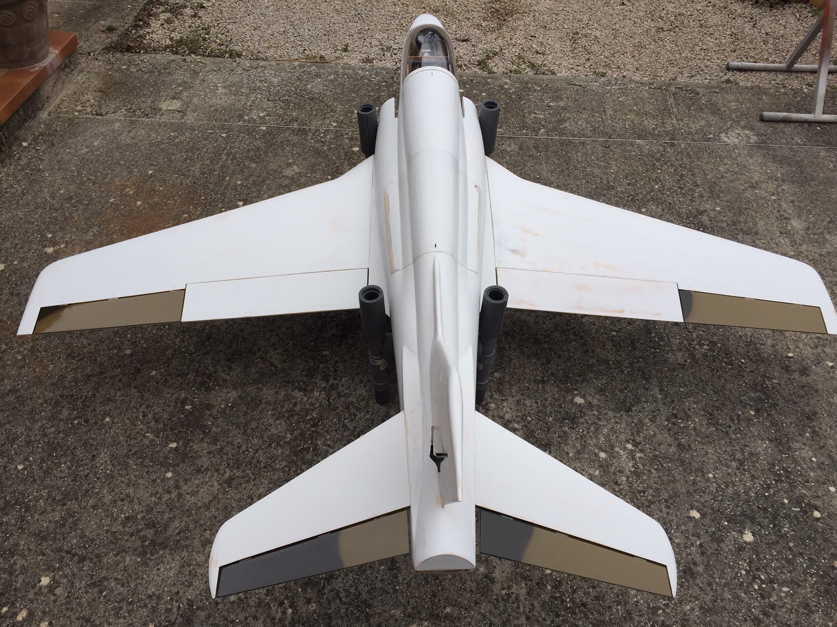Bonjour a tous, Pinson tu as tout a fait raison, j ai mis vis et nylstop. J ai fait un petit support pour tenir le robinet entre la pompe et le reacteur, et un support pour le transport du fuselage. Fait avec des tubes PVC et des raccords (idée piquée sur un magazine RC), c est leger, rigide, ca revient pas trop cher. Le petit plus c est que je peux faire fonctionner les trains rentrant sur le support, ca me permet de preparer l avion directement sur ce support. L'avion rentre dans ma 206 break 8-) . Cet apres midi si le temps veux bien se lever j irai faire un tour en piste et faire les tests reacteur, roulage, freinage, test de porté etc...