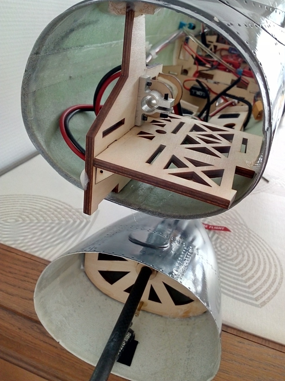 Le principe de fixation de la pointe avant est utilisé pour pour les éléments démontables (ailes stabs,dérives) : une bride en alu est déformée par une vis M3 et vient serrer le tube carbone. Des petits trous sont pratiqués dans le fuselage au droit de chaque vis.