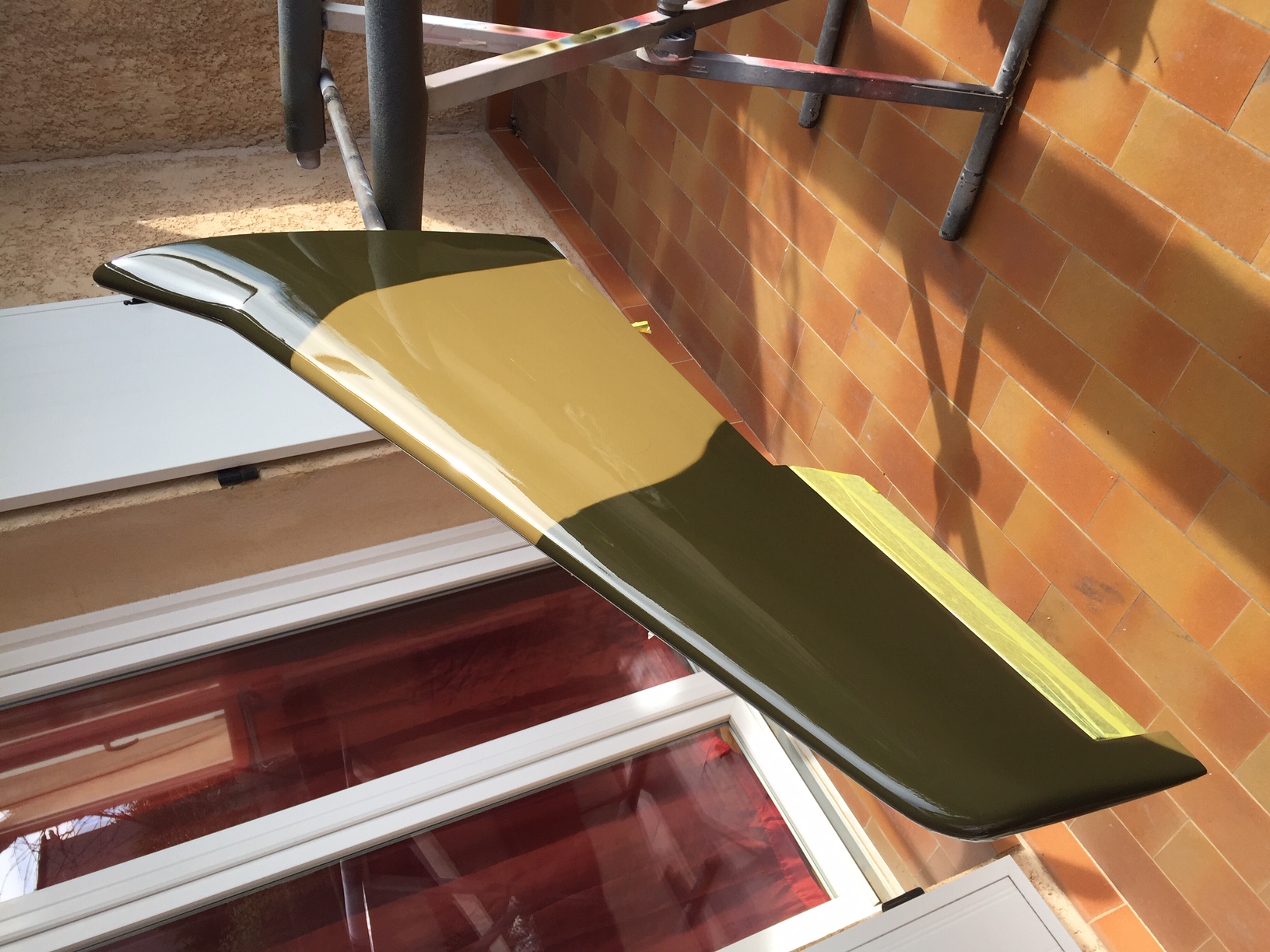 Bonjour à tous, merci Hubert toujours des mots gentils c est sympa, Paulin la moto est une rc51 (une autre passion). J avais décidé de ne pas faire les lignes de tôle , mais c etait dans l optique d une deco tres flashy (warbird finalement), et le fait de graver ces lignes avec le risque de passer au travers de la fibre ne me plaisait pas, faire des surepaisseur pas bon non plus trop lourd, puis j ai trouvé des " lines" tres fine 0.5mm je crois (prevus pour les ongles de ces dames) et là, pas de surplus de poids, lignes tres fines OK ca me va. La métode: je colle ces lines comme sur le plan 3 vues, je peins, (je serai peut etre obigé de poncer la peinture sur les lines pour pouvoir les retirer) leger coup d aeographe dans la rainure , (avec l aerographe aucune epaisseur), puis vernis qui va reduire encore legerement la largeur de la rainure, mais avec l'epaisseur de la peinture devrait laisser une belle ligne de tôle (à verifier). Je fais la peinture sur l'aile la plus legere, comme ca j enleverrai le plomb et j aurais une idée plus precise sur la prise de poids dû à la peinture. Photos