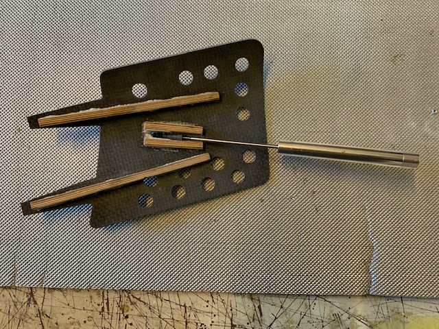 Souhaitant respecter la cinématique du vrai, j'ai collé deux petits palonniers en fibre qui viennent prendre la chape à rotule du vérin en sandwich à l'extérieur de l'AF. ils sont donc visibles, un petit cache non indispensable mais dans l'esprit semi maquette viendra par la suite comme sur le vrai protéger cet ensemble.