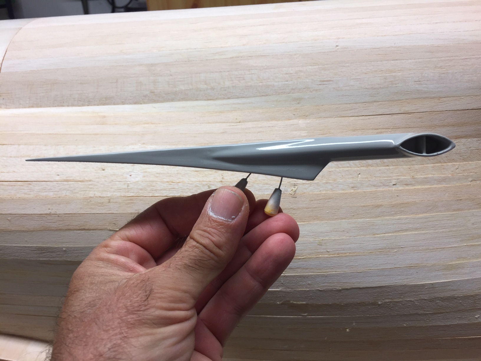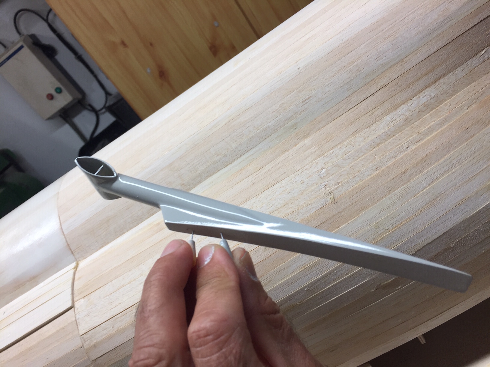 La premiere est une surface de stab qui doit faire environ 1/4 de la surface alaire, la seconde un volume de stab qui doit etre compris entre 0.3 (racer) et 1 (vol aux grands angles), et un bras de levier important est preferable. Pour le bras de levier c'est bon (plus d'un metre), pour avoir une surface de 1/4 de la surface alaire je dois me conformer au plan, et pour avoir un volume de stab de 0.3 je peux me rapprocher de la forme d'origine. Si je prends tout ca en compte la forme des stab sera un compromis entre le plan et la maquette. Je vais conserver la longueur de la nervure d'emplanture du plan (31 cm / 28,5 scale), par contre au saumon je passe à 11cm (15 sur le plan/ 8.5 scale), l'envergure est ok, et evidement un profil symetrique (pas trop fin). Ainsi je perd un peu de surface pas rapport au plan (et j'en prend un peu par rapport à la maquette) mais je conserve la forme generale (fleche), je suis à 0.31 en volume de stab; et a peine moins du quart de la voilure, en esperant que le long bras de levier amortisse ce léger déficit de surface.Je reviendrai plus en detail, quand je commencerai la construction. En attendant quelques photos de la piece qui sera juste sous le volet de dérive (j'ai honte je ne sais même pas ce que c'est).Photos