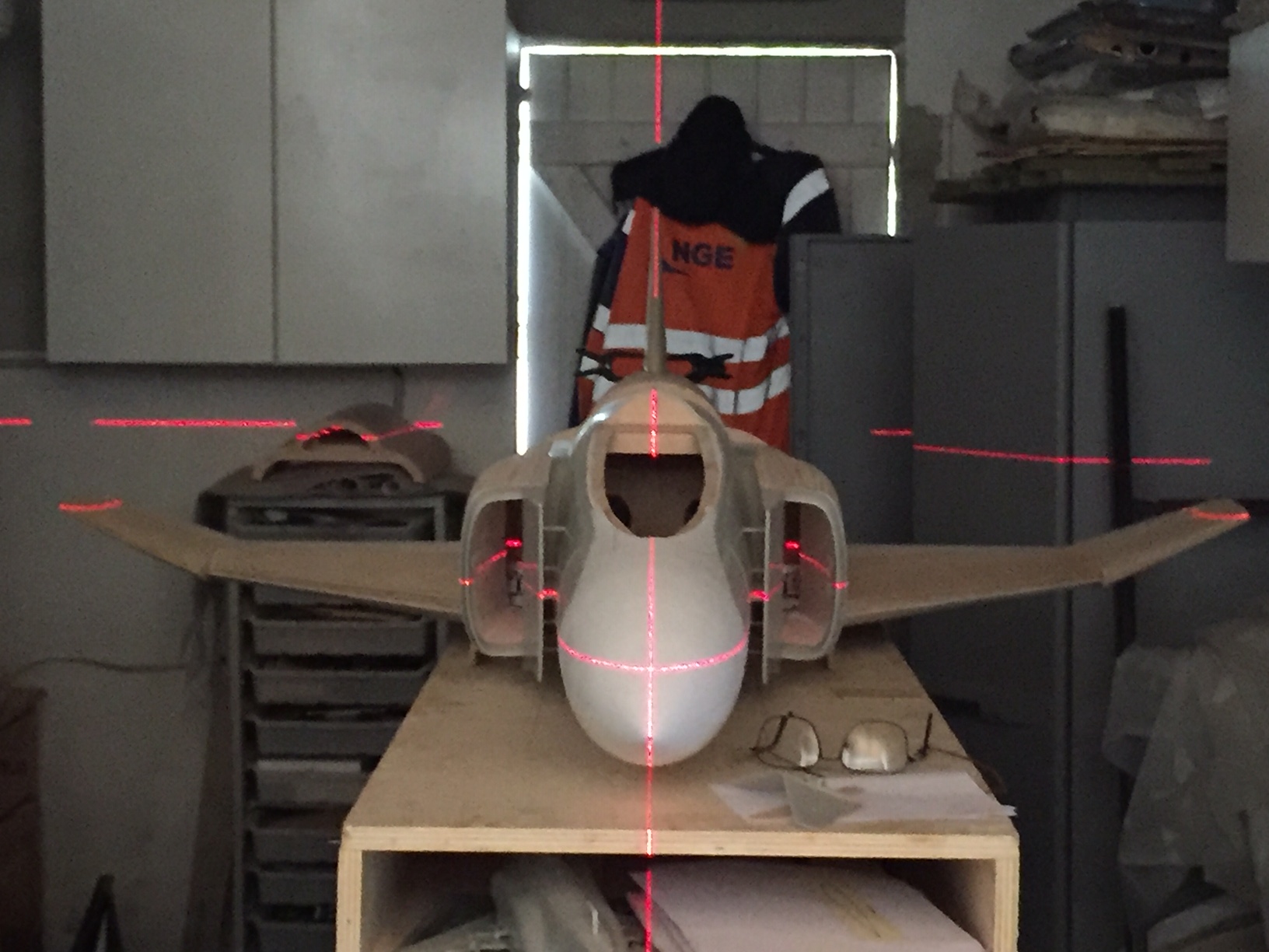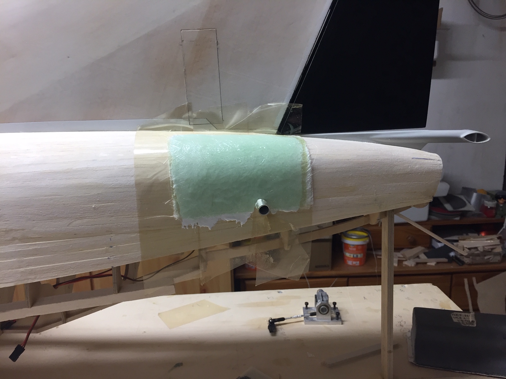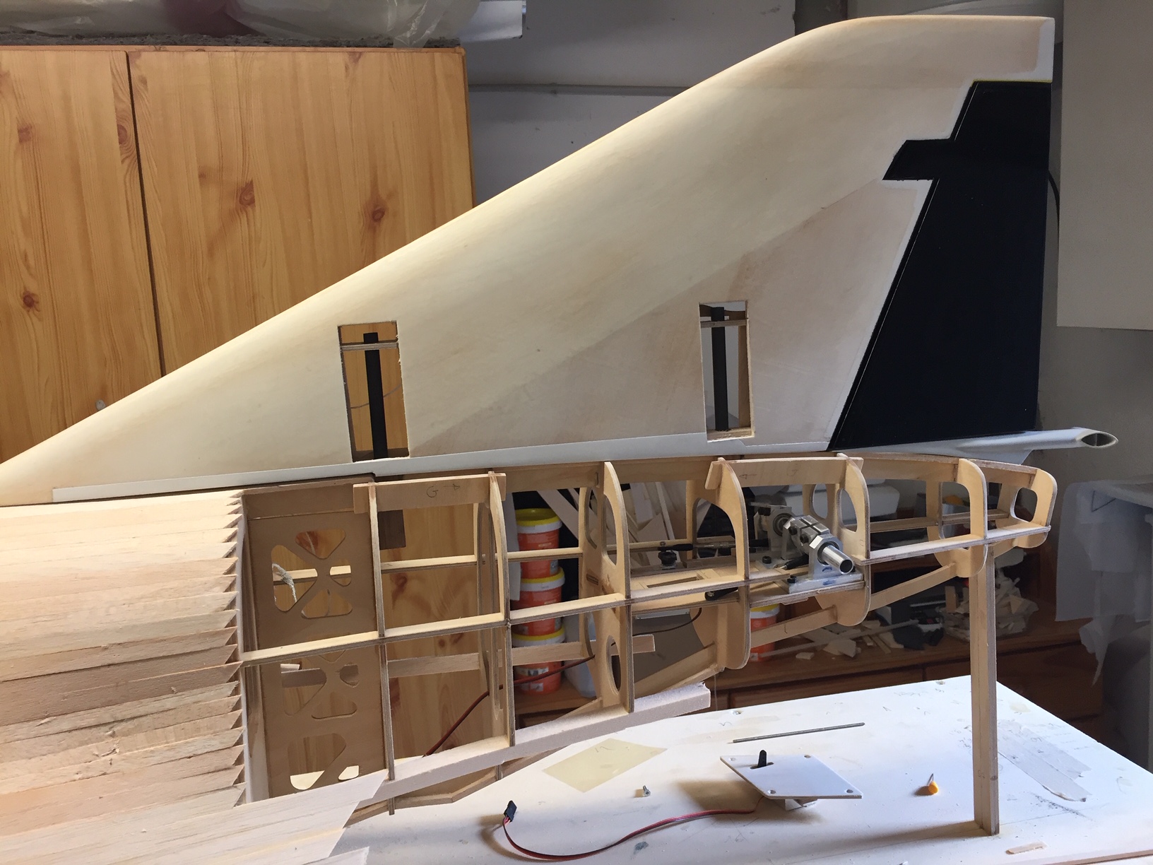 Bonjour à tous, aujourd'hui j'ai collé les supports de dérive sur le fuselage (joncs de carbone de 8mm collés dans des carrés de bois dur eux même collés sur les couples du fuselage). Puis j'ai glissé la dérive sur le fuselage au travers des joncs de carbone pour mesurer et controler au lazer les alignements et les longueurs (mesures bout d'aile/ haut de dérive ok). Je dois encore faire la finition du volet de dérive puis coller les charnieres avant la mise en croix définitive (collage de la dérive sur le fuselage). Photos